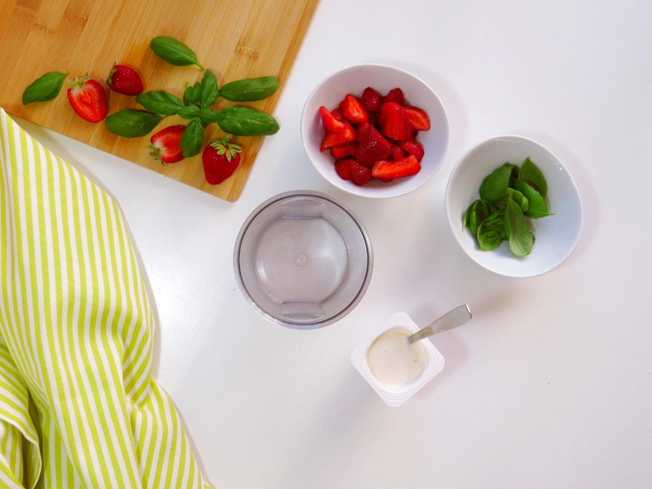 2-Num copo alto, coloque o iogurte, os morangos e as folhas de manjericão. Triture com a varinha mágica.