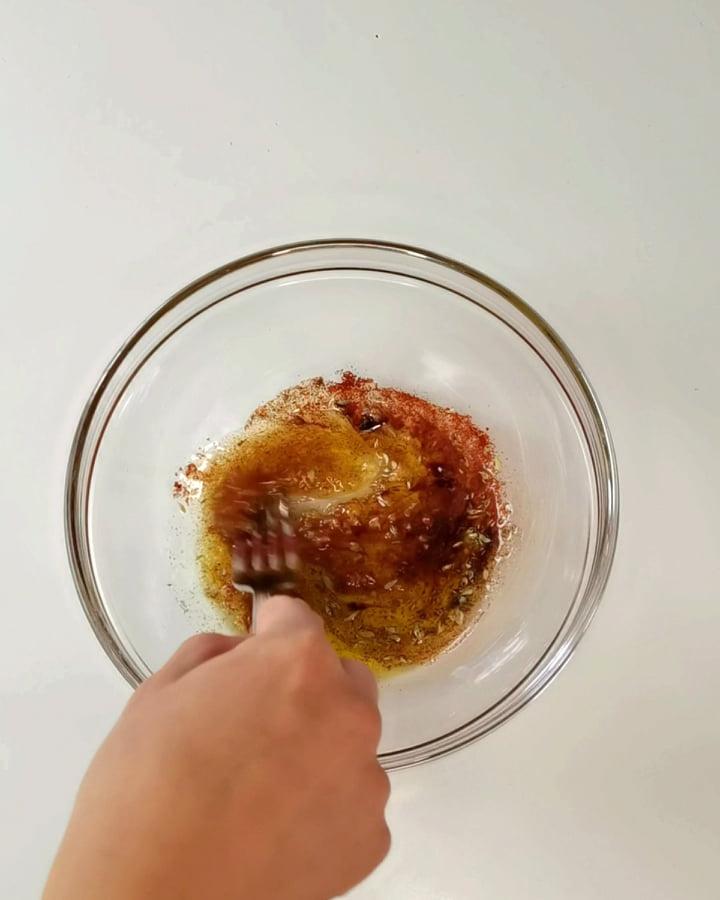 - Numa tigela, prepara os temperos: Junta o azeite, o alho, o sal, a paprika, a pimenta preta e os orégãos. Mexe bem.
