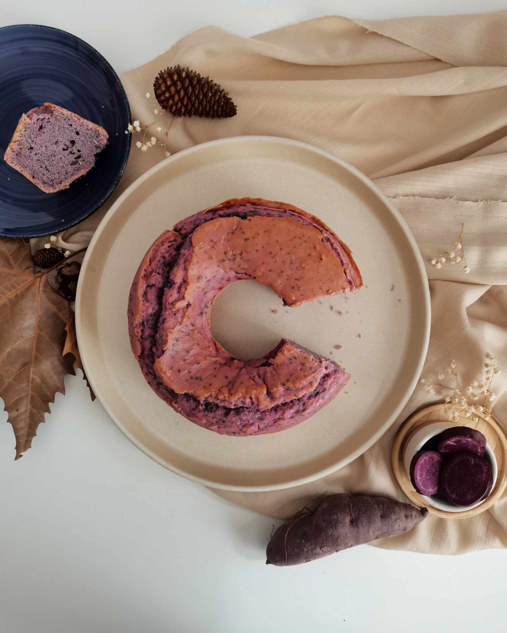 Ao contrário de muitos bolos densos, este bolo de batata doce roxa oferece uma textura surpreendentemente leve e macia. Cada fatia é uma combinação surpreendente entre aspeto e sabor, proporcionando uma experiência deliciosa que vai conquistar todos.