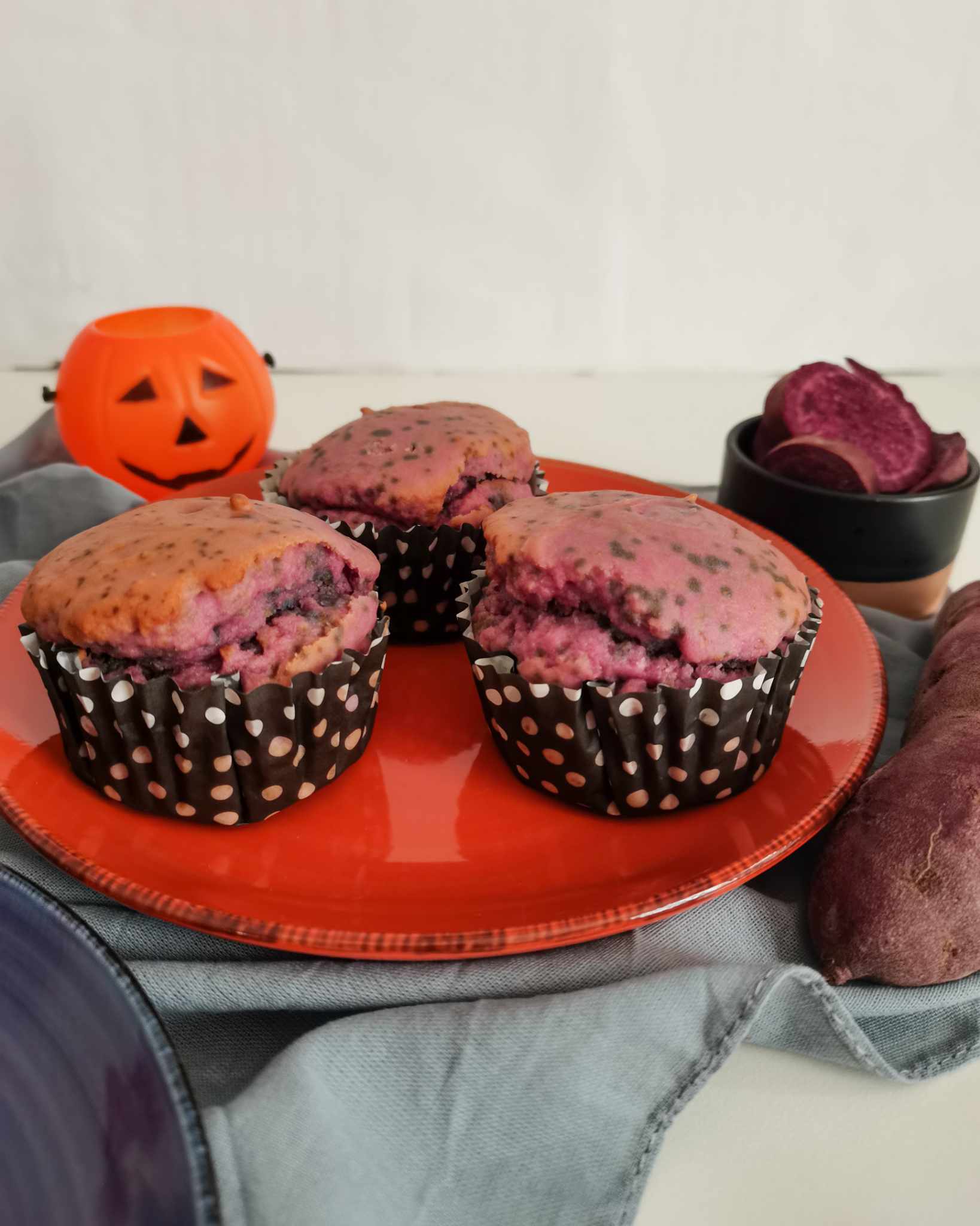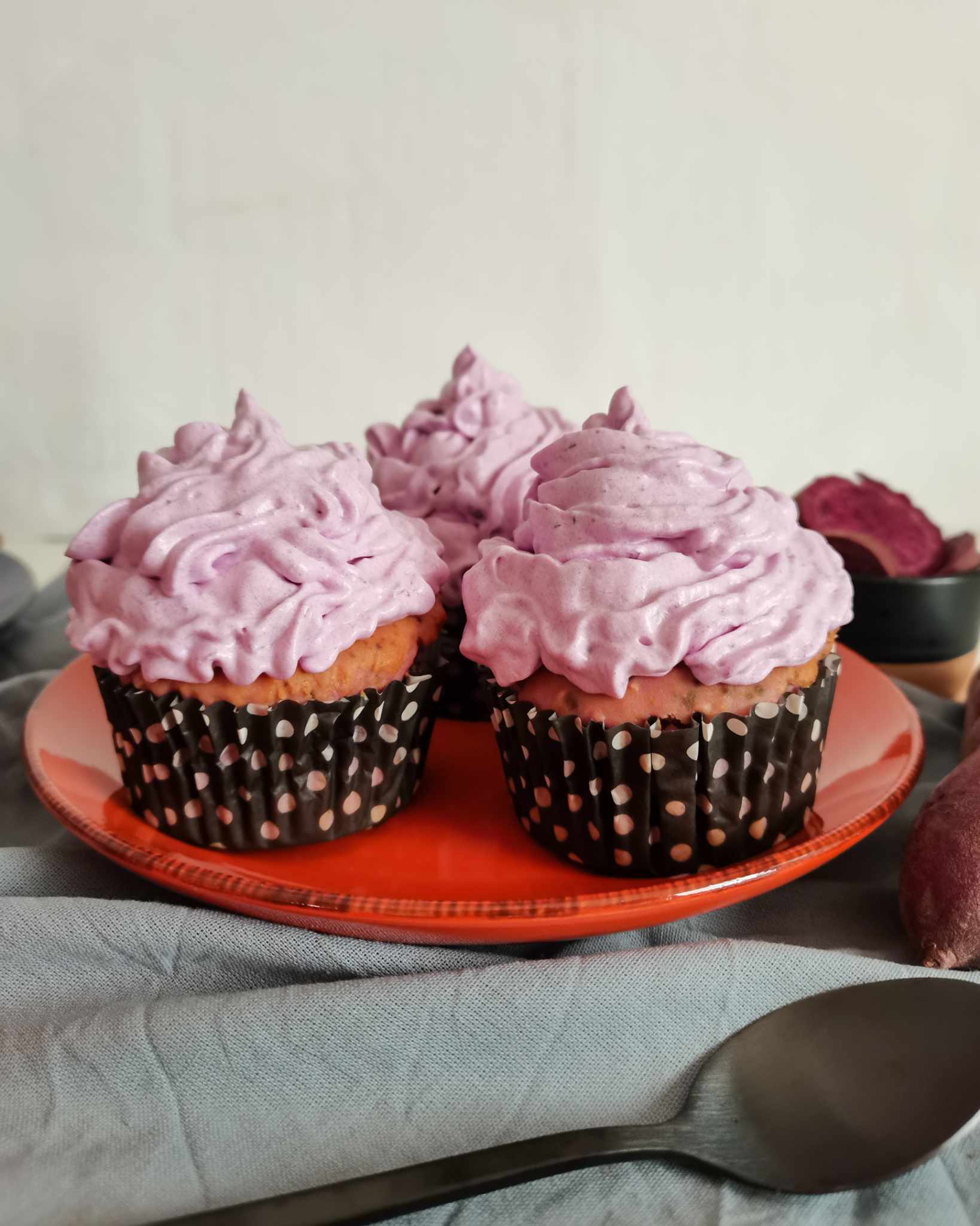 - Bolo de batata roxa em forma de bolo ou em cupcake.