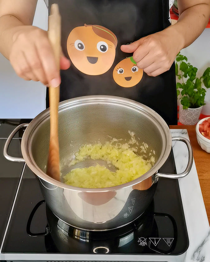 - Em primeiro lugar, deita um fio de azeite num tacho e leva ao fogão. Assim que esteja quente, adiciona a cebola, deixa refogar um pouco e junta o alho.