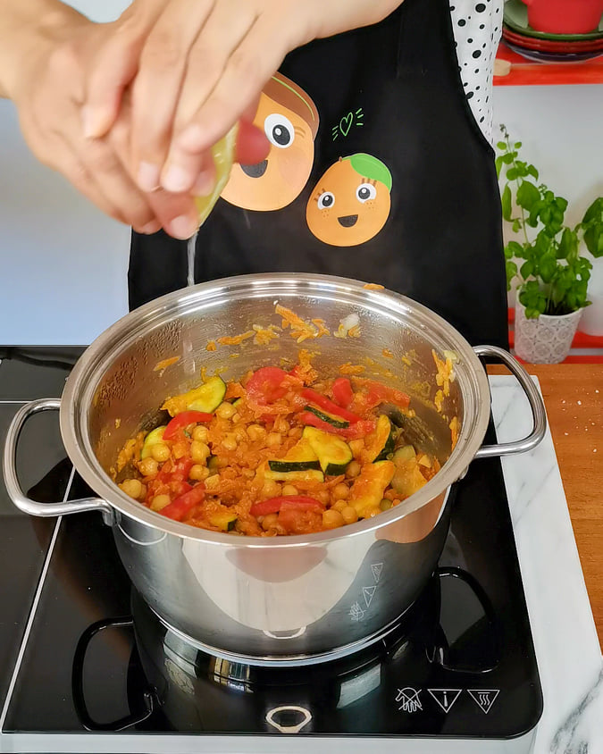 - Depois é acrescentar os legumes e os temperos., finalizando com sumo de limão.