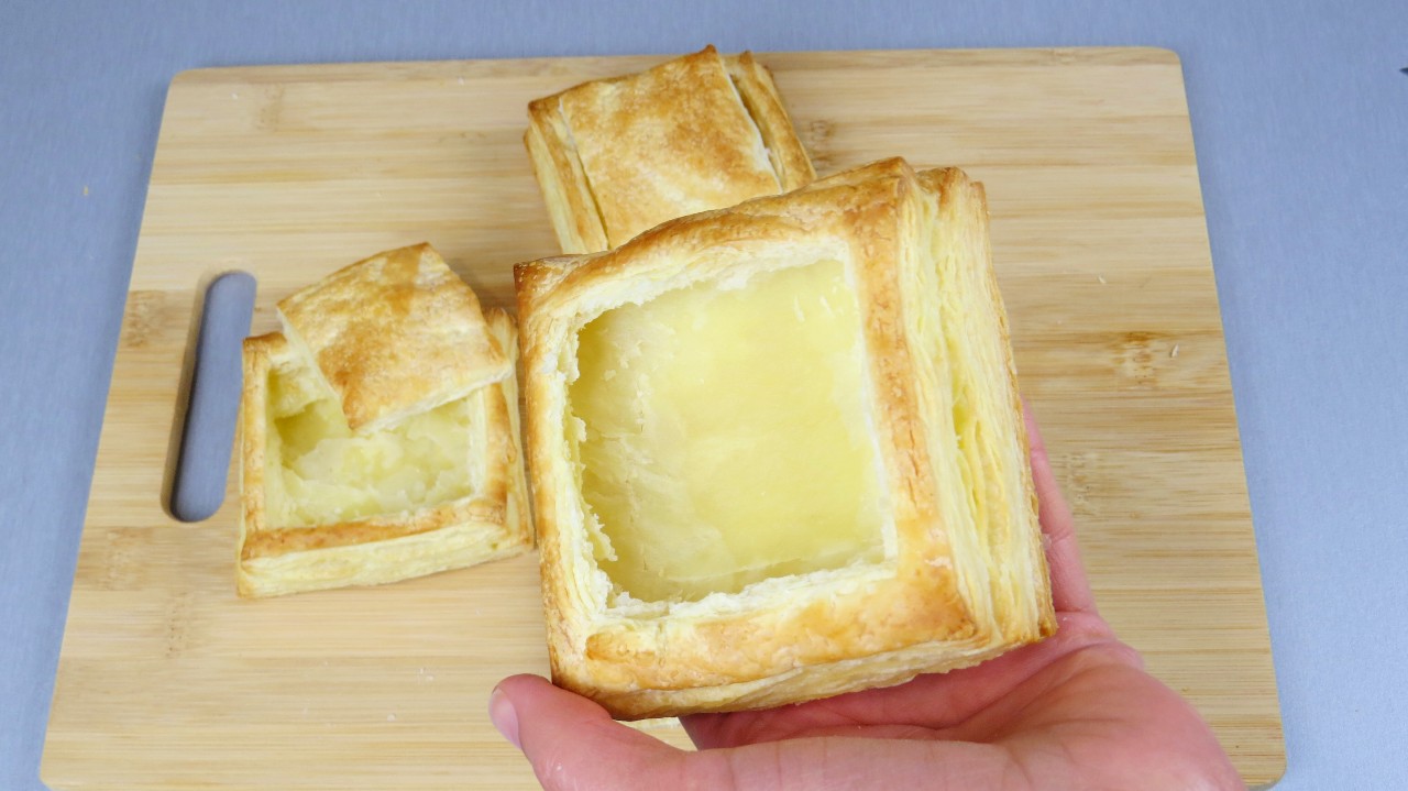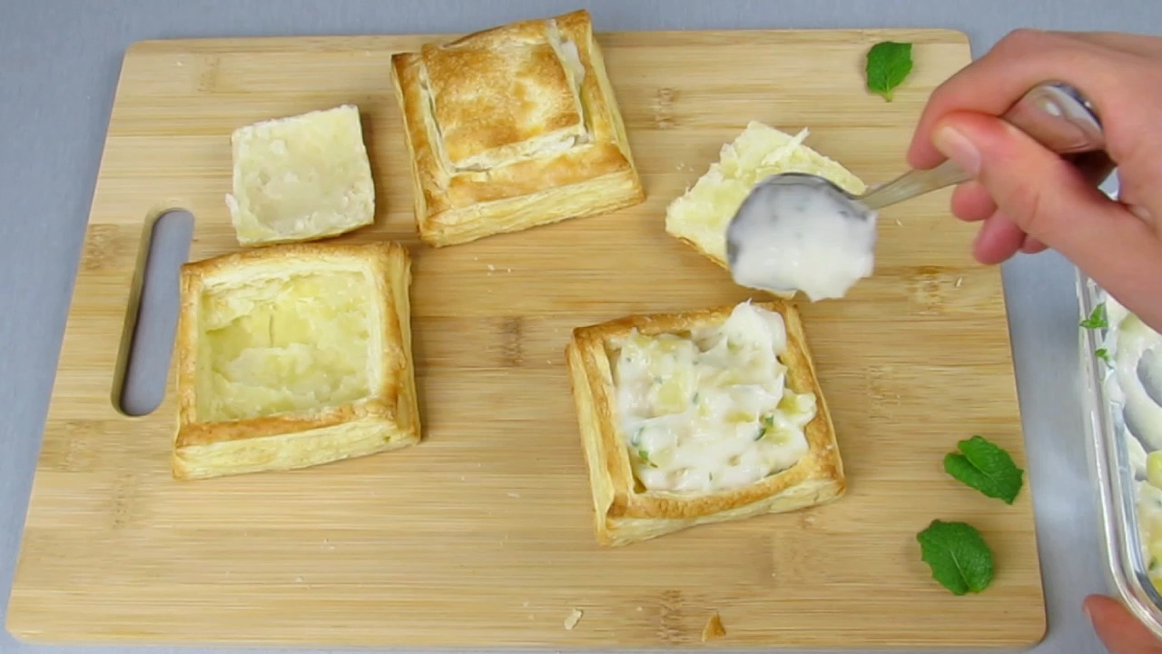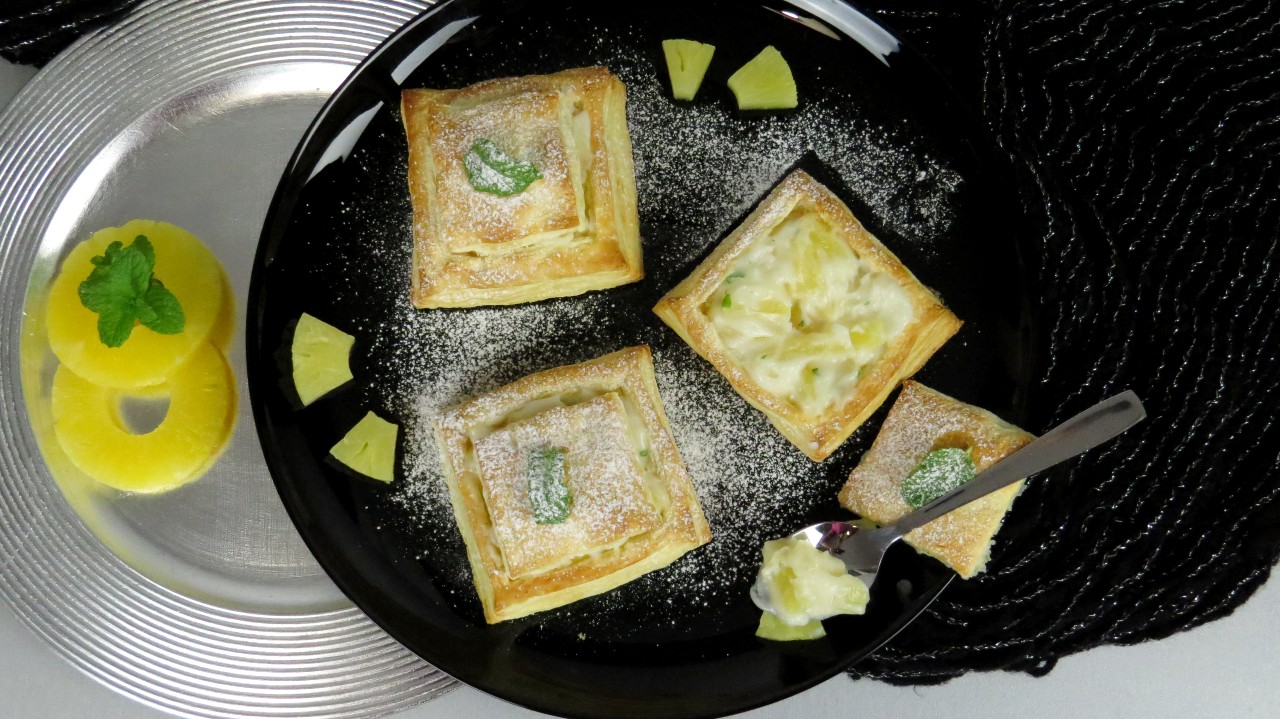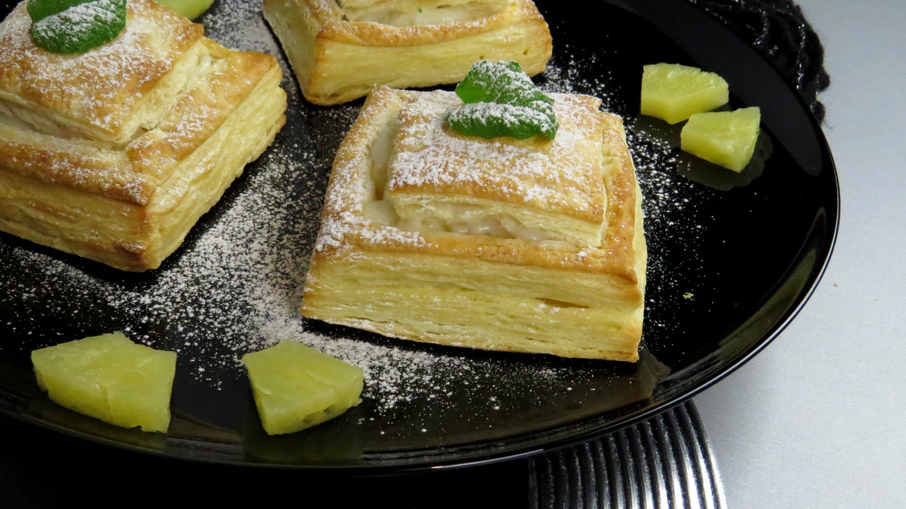 Se não gosta muito de ananás, faça com outro recheio, mousse de chocolate e natas, creme de limão e mirtilos, chantilly e morangos frescos ou outro recheio que mais gostar desde que não sejam muito líquidos para a massa folhada não ficar mole.