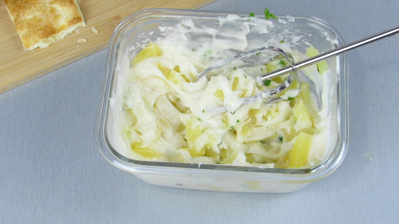 - Depois bata o creme com a batedeira eléctrica. Adicione as rodelas de ananás cortadas aos pedaços e envolva com uma colher.