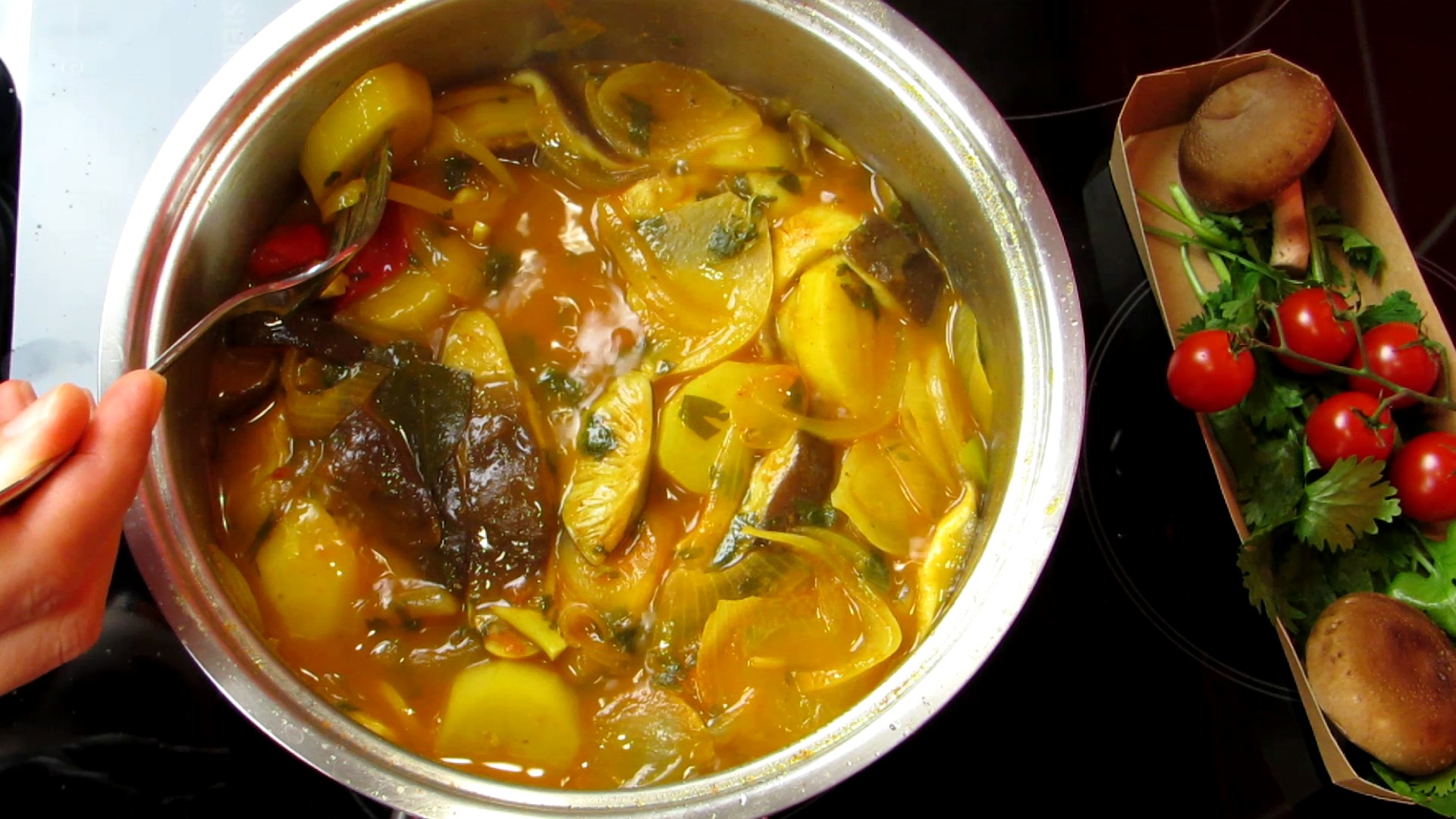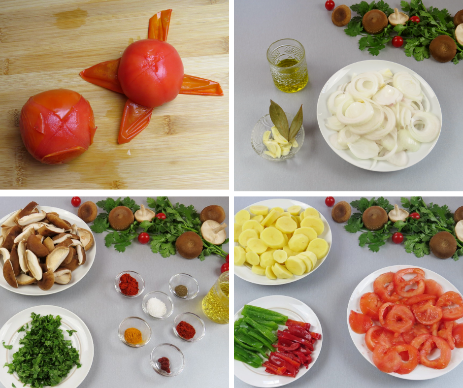 - De seguida, desliga o lume e distribui uniformemente, metade do tomate, do pimento, das batatas, dos cogumelos, da cebola, do alho, da folha de louro e dos coentros. Repete este processo até terminar os ingredientes.
