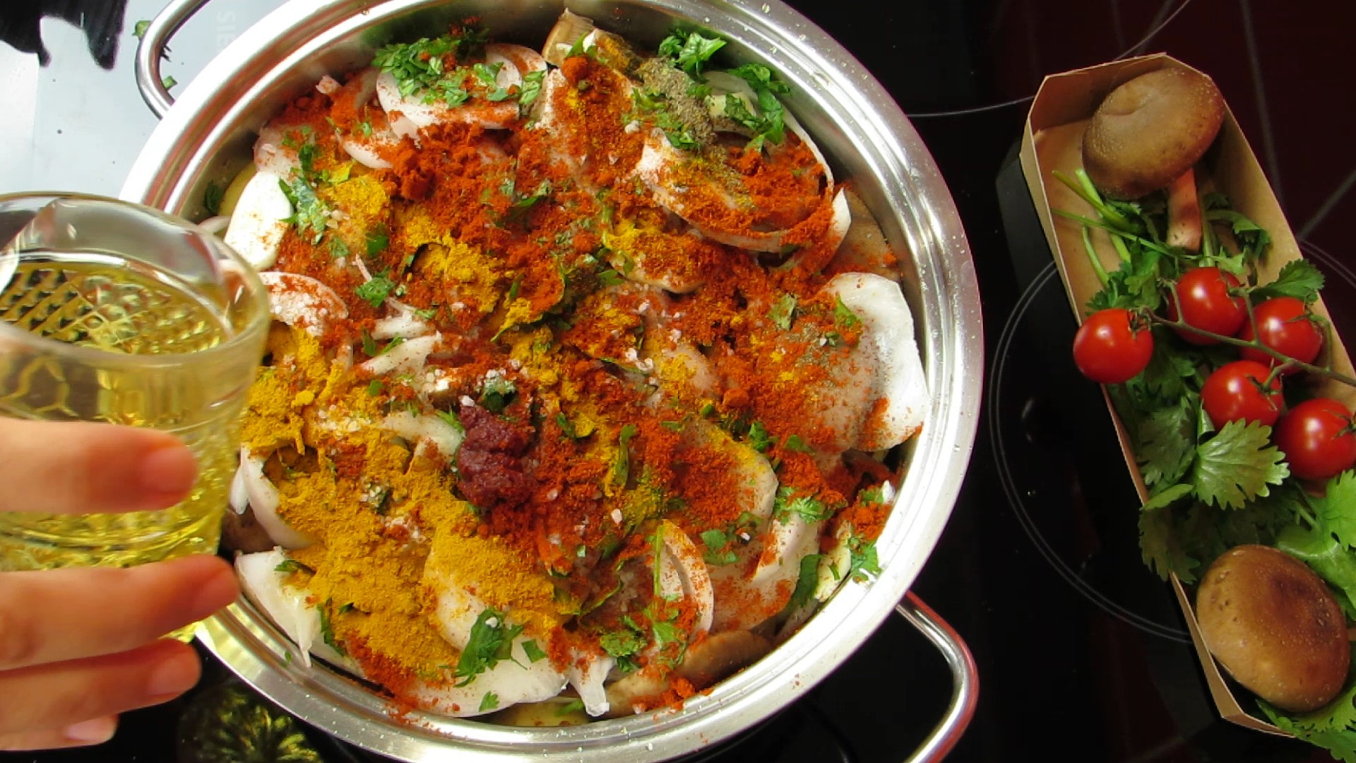 - De seguida, colocas todos os ingredientes em camadas alternadas e junta os temperos;