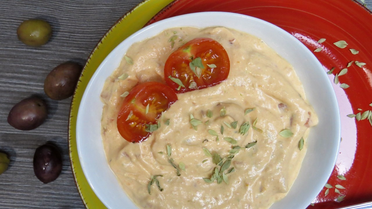 Tem um sabor muito, muito bom. Os tomates, o seco e o fresco junto com uma pitada de orégãos, uma maionese e mais uns pozinhos de perlim-pim-pim formam um creme delicioso.