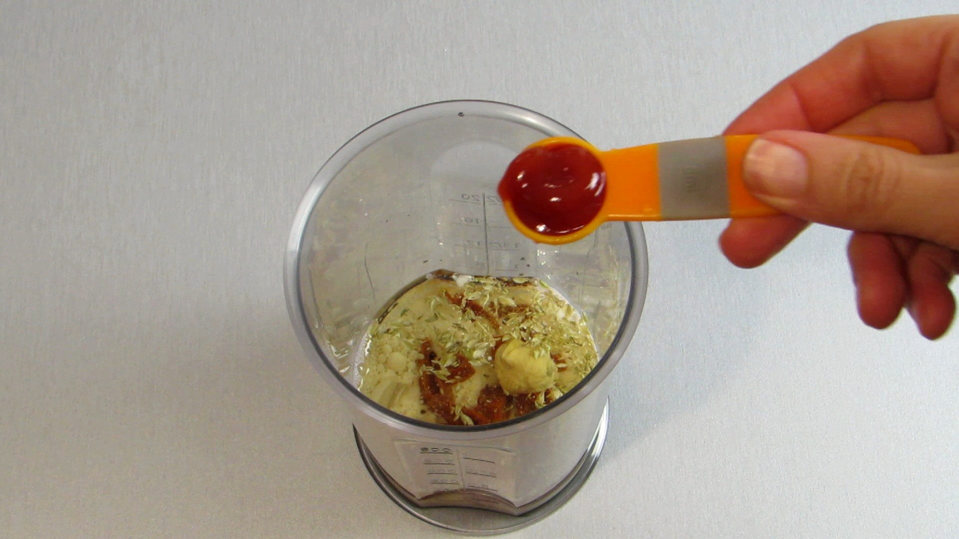- Num copo alto, coloque todos os ingredientes (com excepção do tomate fresco) o leite de soja, o óleo, o sumo de limão, o sal, os orégãos, o alho, o tomate seco, a mostarda e o ketchup.