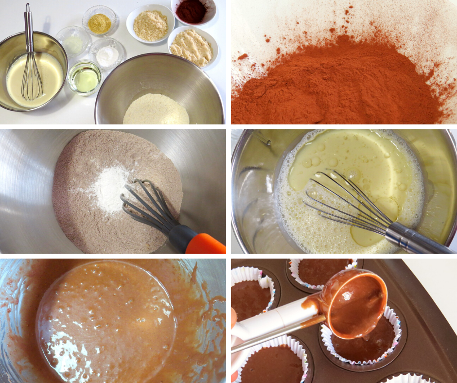 2 – Numa tigela, misture todos os ingredientes secos, passando-os numa peneira ou envolvendo-os bem com uma vara de arames para que fique uma mistura homogénea, fofa e sem grãos. Misture a farinha, o amido, o cacau, o sal, o açúcar, a linhaça, o fermento e o bicarbonato.