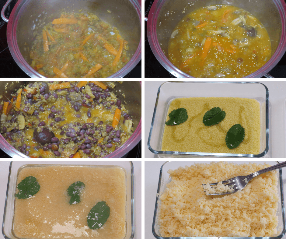 - Agora é a vez do cuscus. Coloque água a ferver. Pegue num recipiente com tampa. Deite o cuscus no recipiente, tempere com uma pitada de sal, um fio de azeite e folhas de hortelã. Despeje cuidadosamente a água no recipiente. A água que fica acima do cuscus deverá ter cerca de metade da altura do cuscus. A água é absorvida muito rapidamente. Quando colocar a água, tape logo de seguida com a tampa. Passados uns 5 minutos, destape e com um garfo solte os grãos de cuscus.