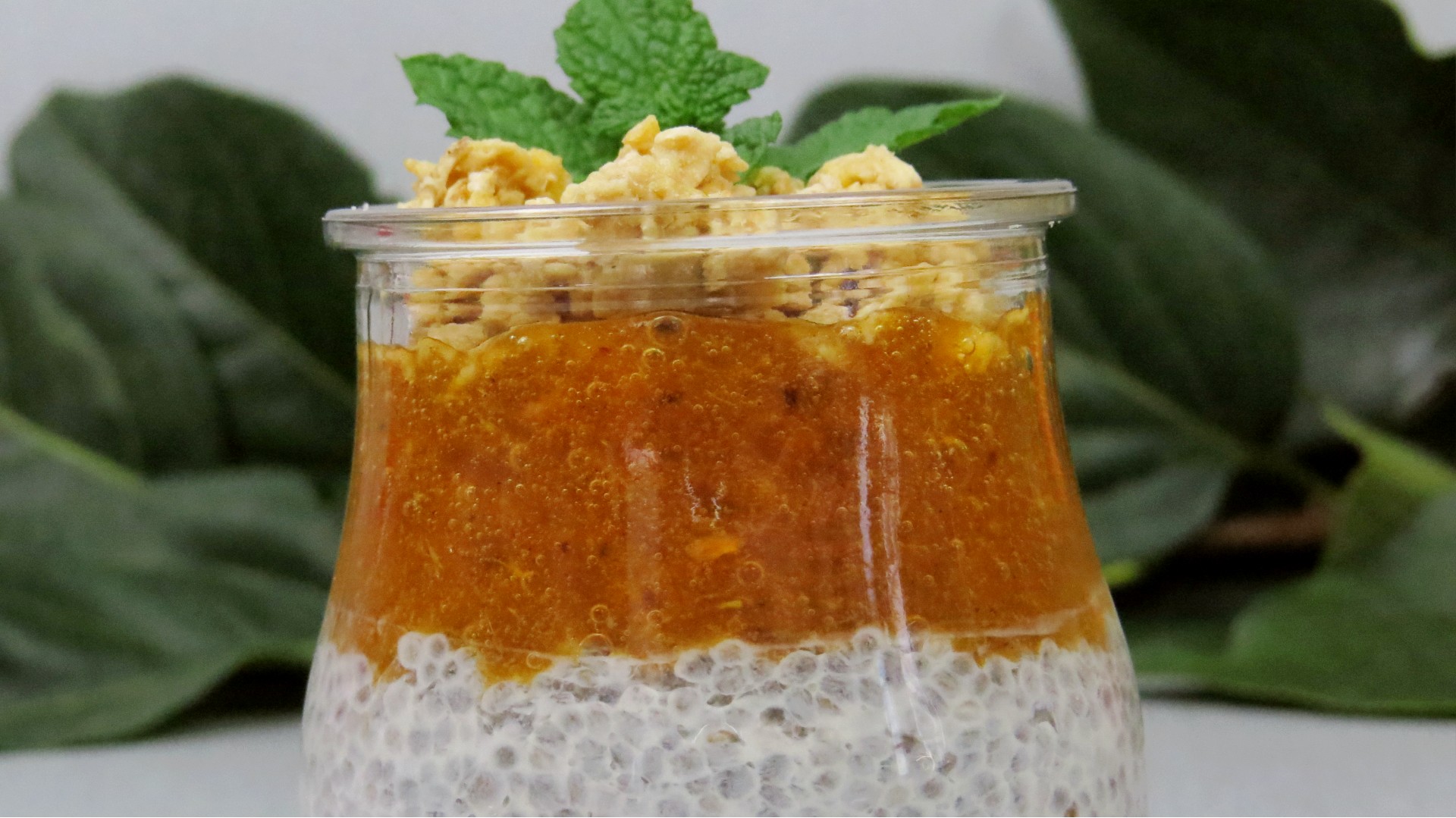 - Para servir, coloque muesli crocante por cima e decore com umas folhas de hortelã.