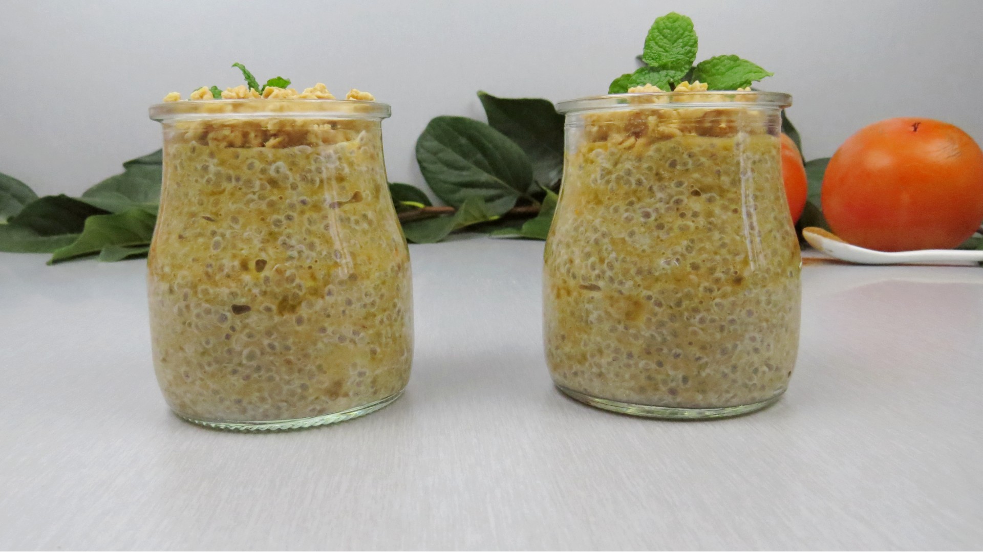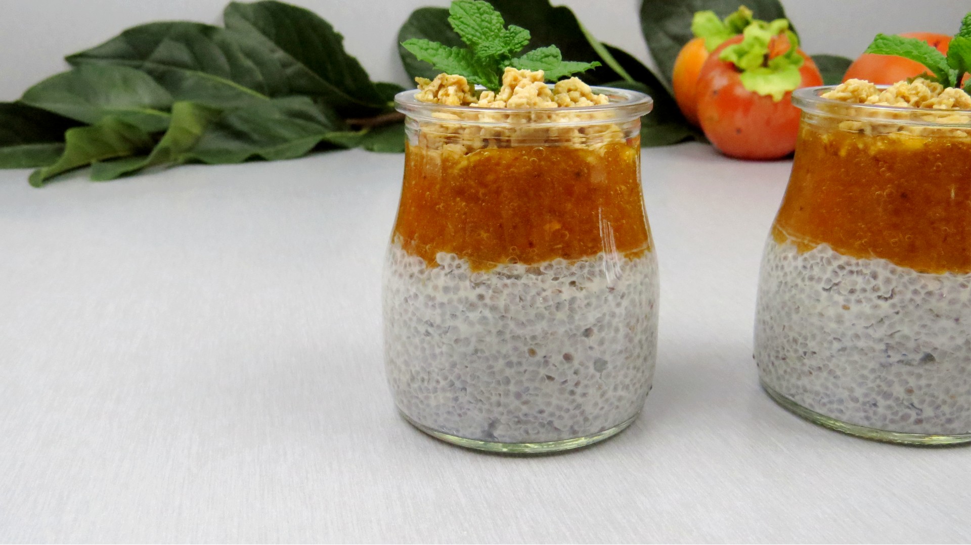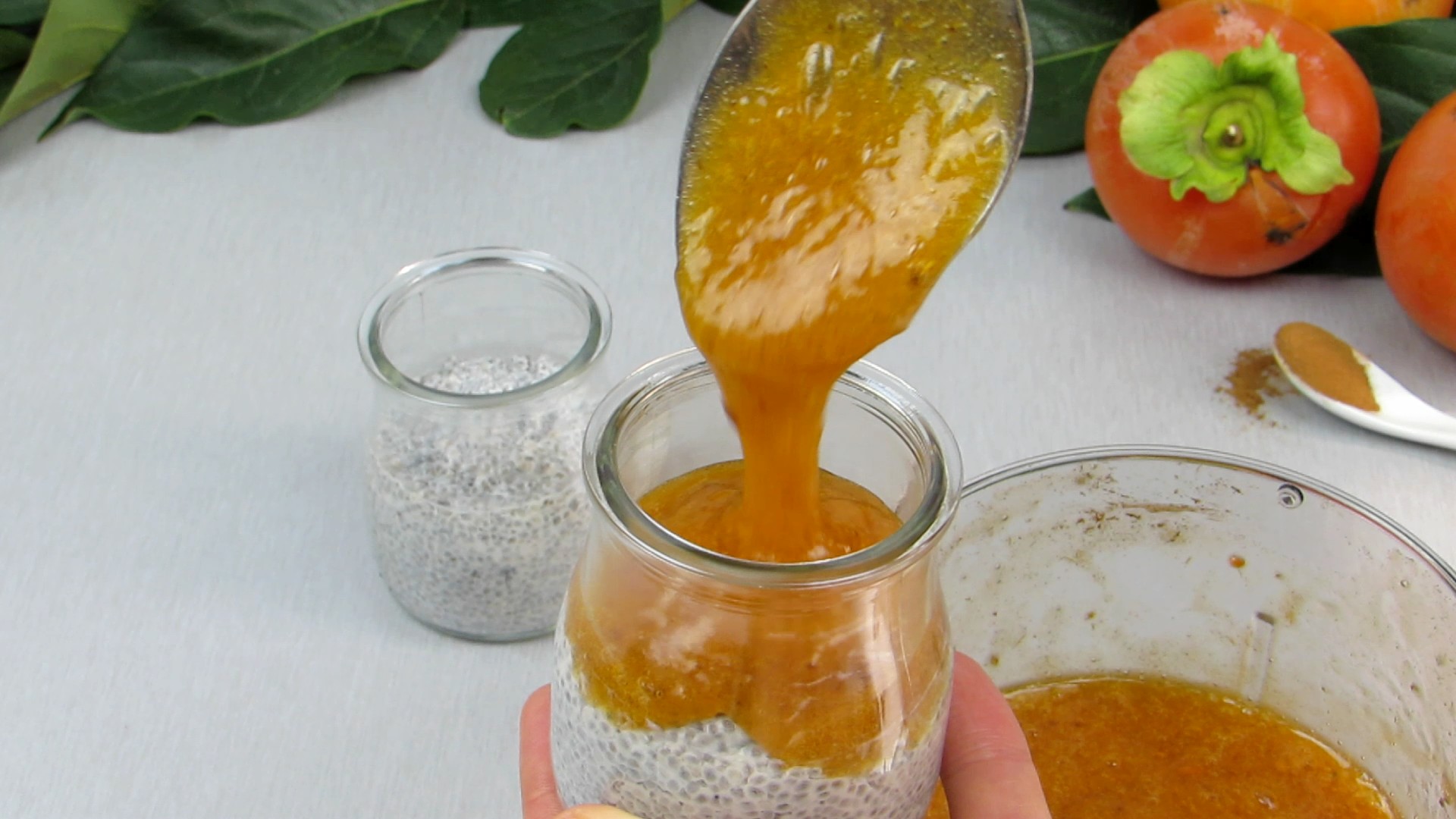 - Encha os copos um pouco mais de meio. Depois, preencha o restante copo com a mistura de dióspiro.