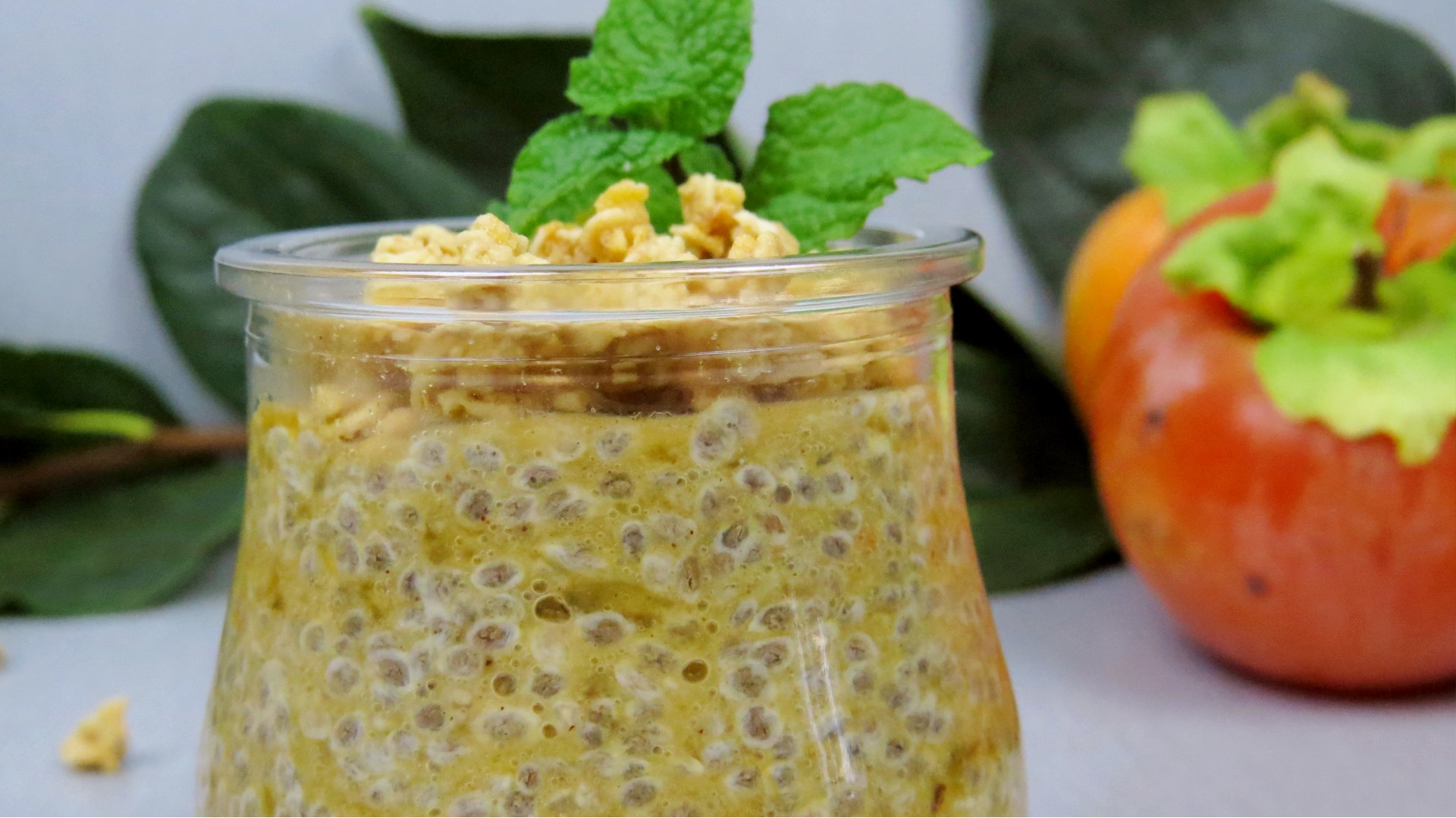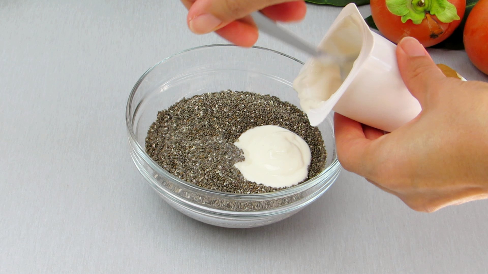 - Faça a mesma mistura de chia, numa tigela, deite a chia e acrescente o leite e o yogurte. Mexa. De seguida, misture o dióspiro que lhe sobrou da receita anterior. Mexa até estar bem envolvido.