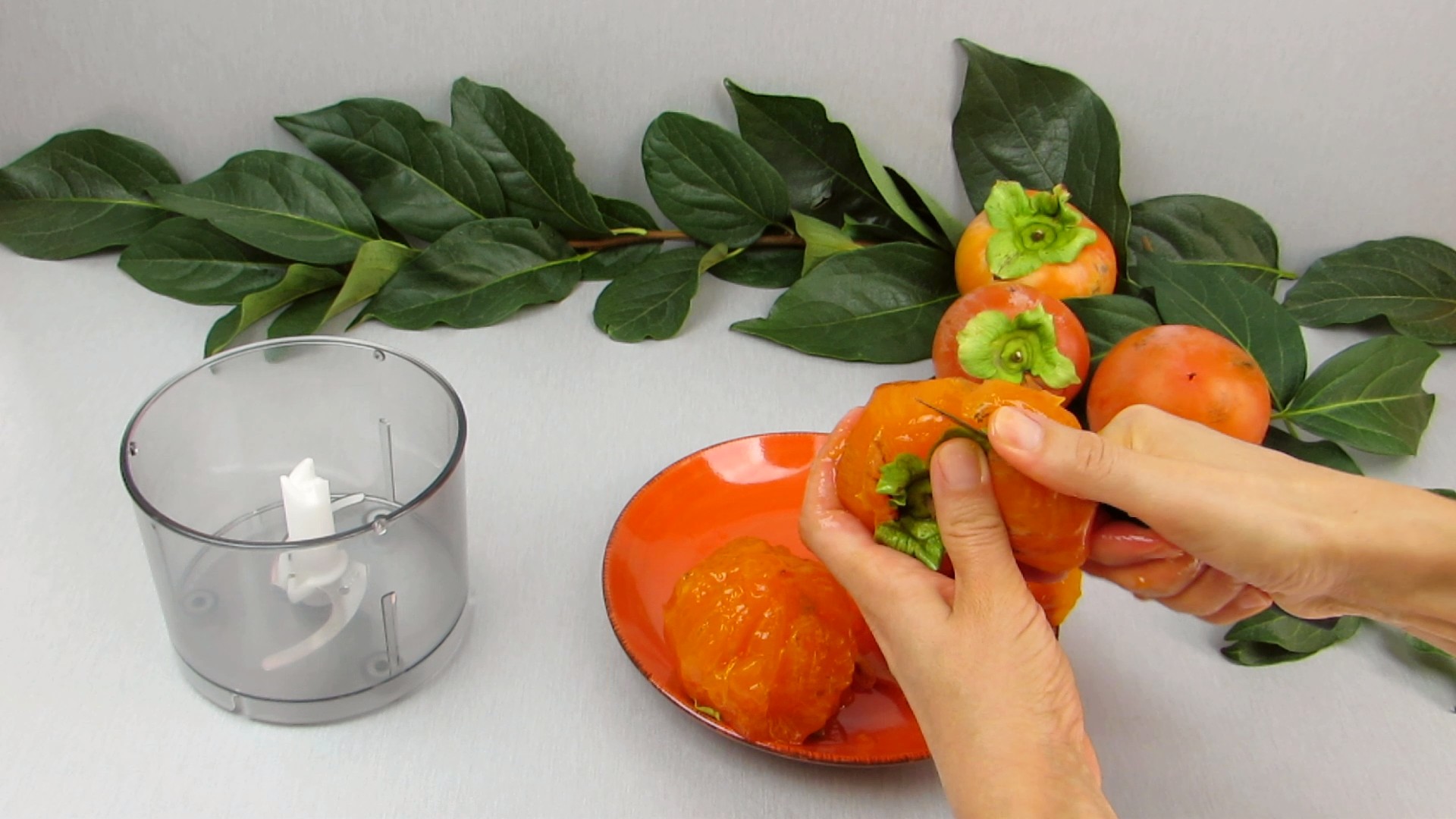 - Descasque os dióspiros, junte a canela e triture com uma picadora ou varinha mágica. Reserve .