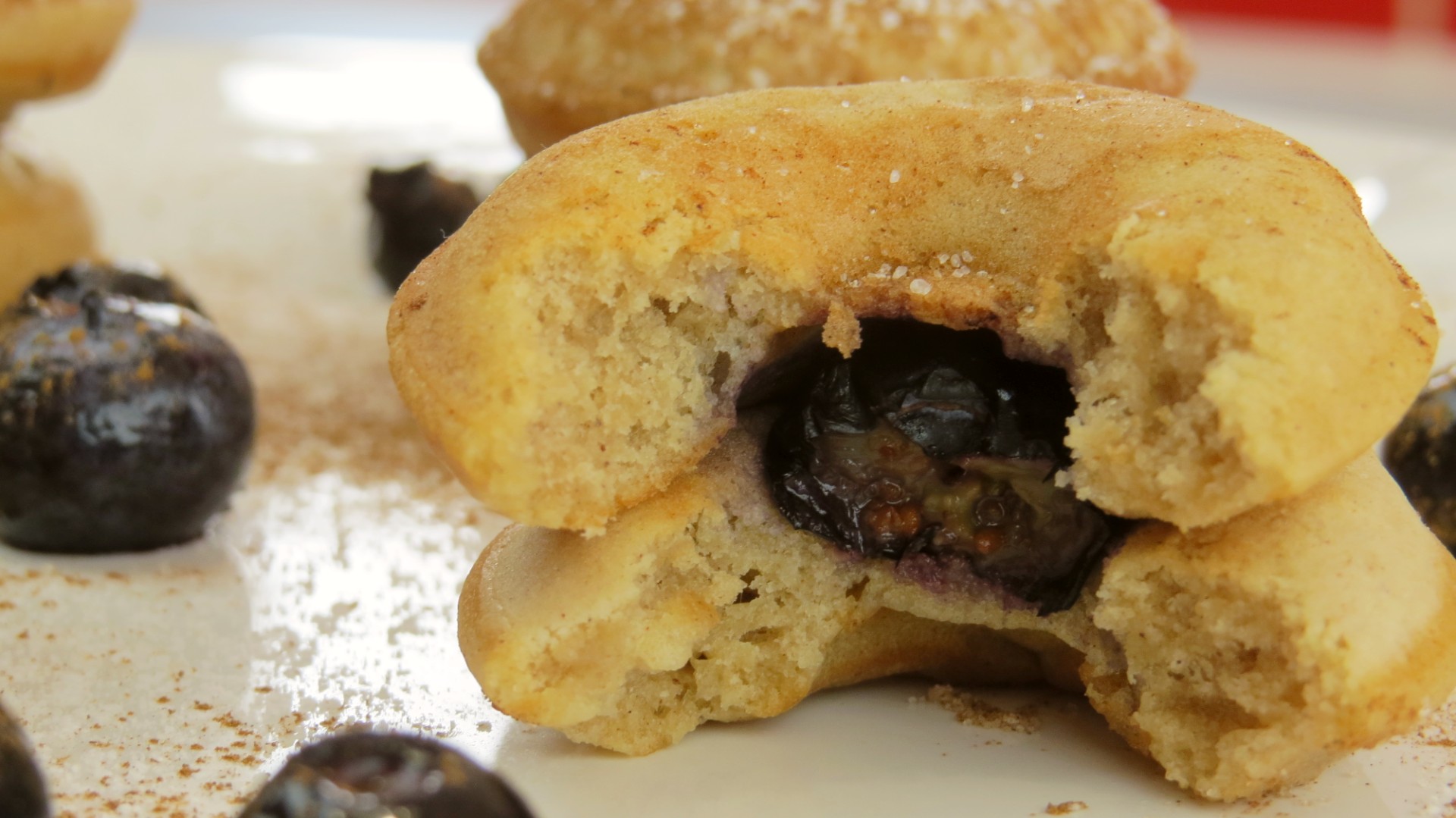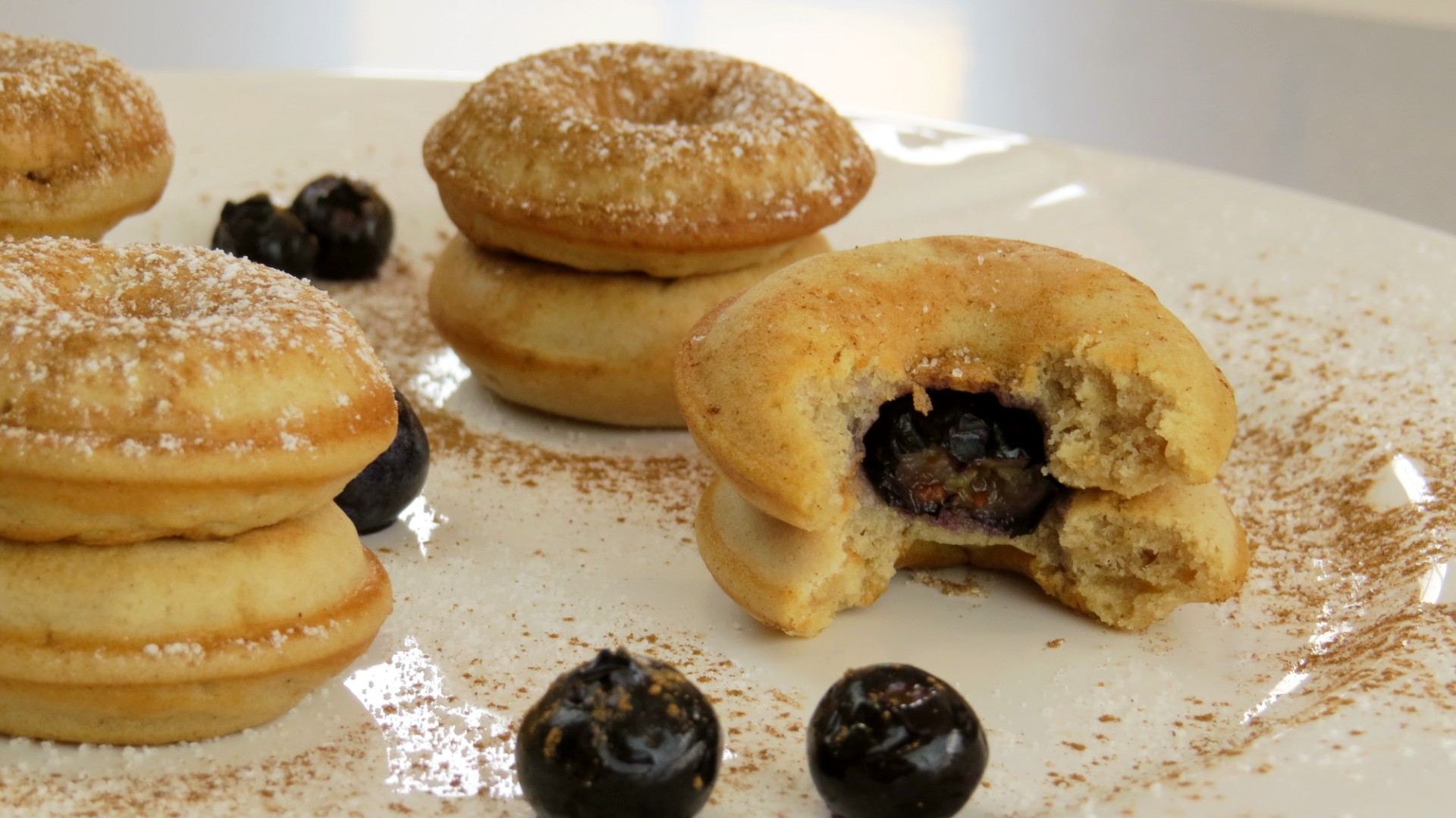 Para a decoração e acompanhamento tem uma panóplia de alternativas… aqui fiz mais simples e saudável e com uma pequena surpresa, dois donuts e um mirtilo no interior, com açúcar e canela em pó por cima. Pode fazer também com uma bola de gelado, mergulhá-los em chocolate derretido ou calda de açúcar, com doce de frutas, chantilly ou o que mais gostar…