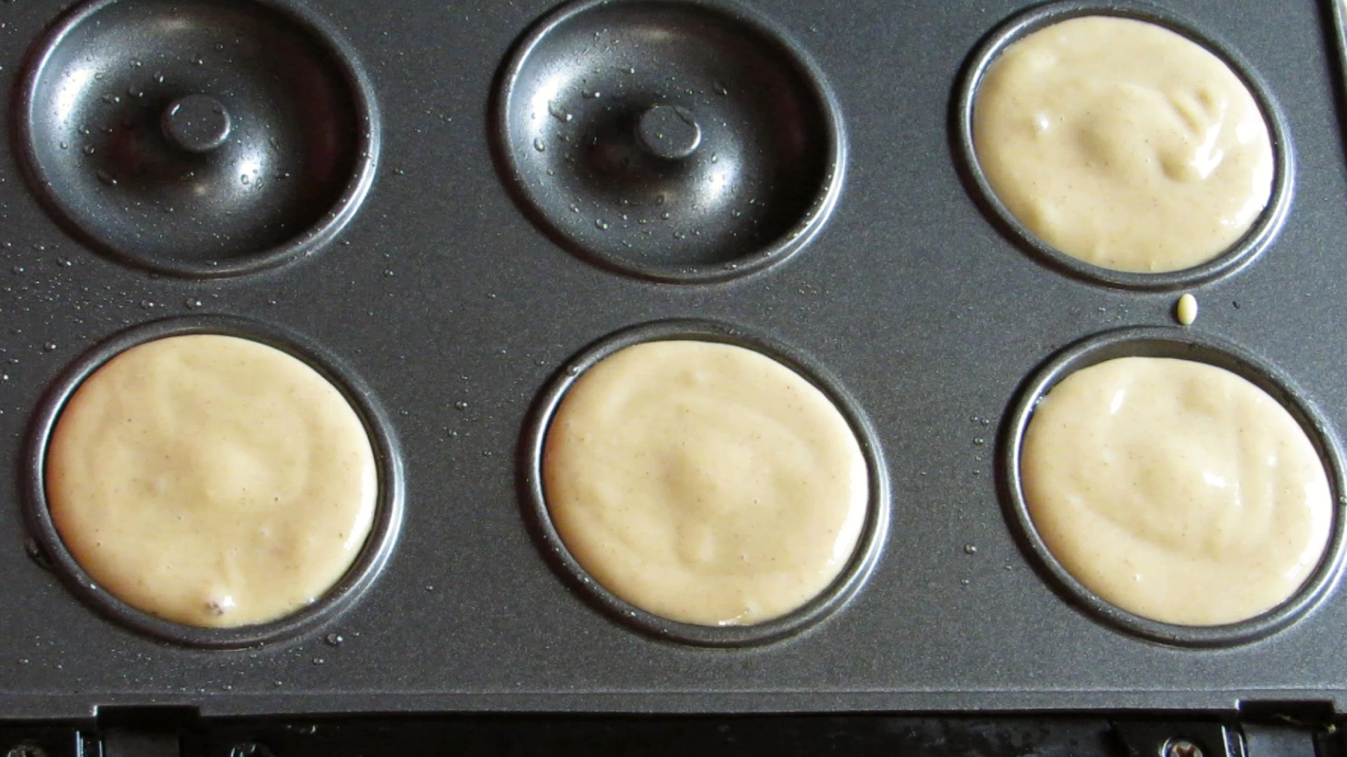Deite a mistura na máquina dos donuts, a quantidade depende da capacidade da máquina, para a minha, coloco um pouco menos de 1 colher de sopa e deixo cerca de 4 minutos de cada vez.