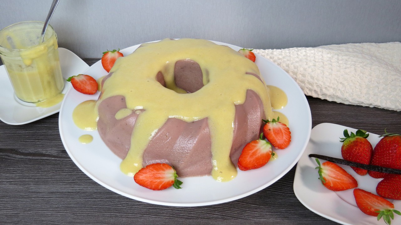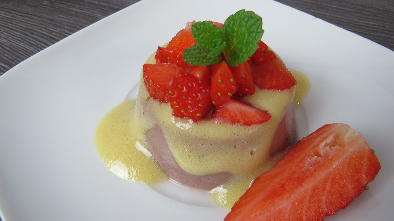 - Um pudim de frutos vermelhos com espuma de baunilha
