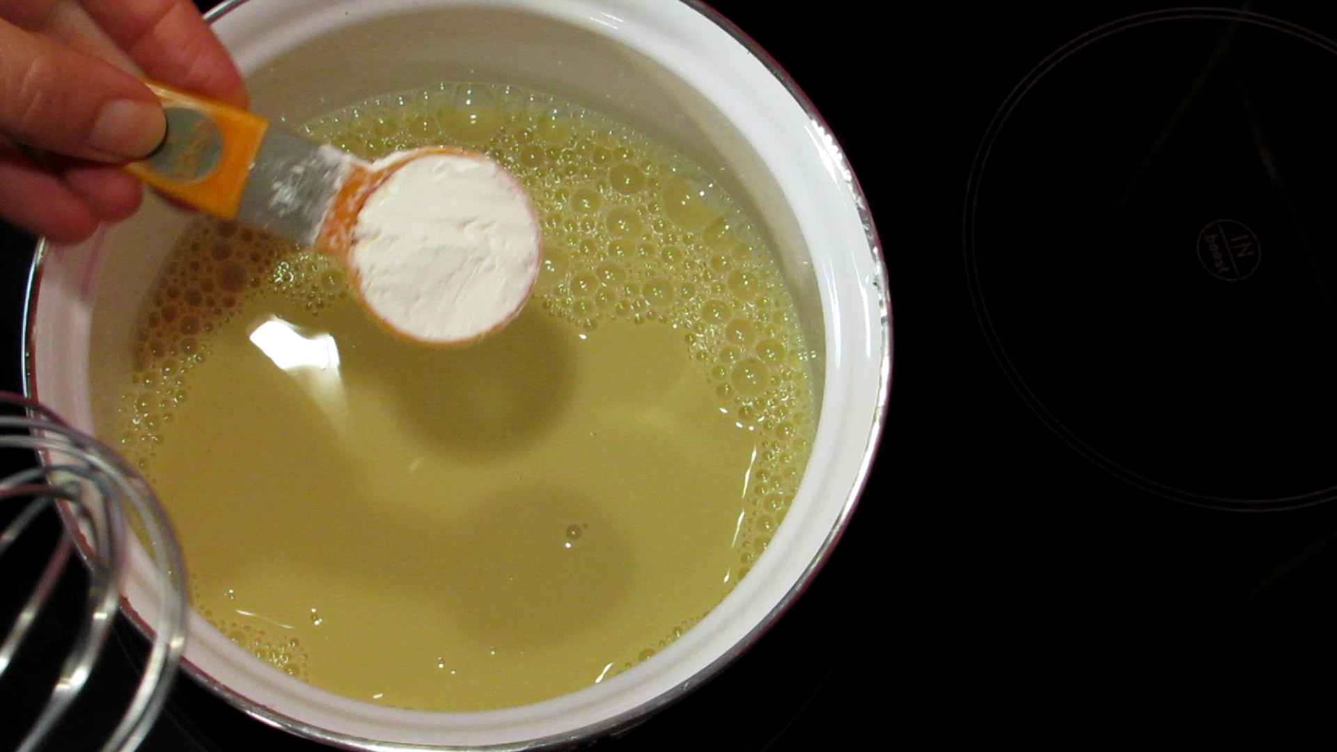 - Junte o amido de milho e volte a mexer bem para que não haja grumos. Acrescente o açúcar e volte a mexer bem para dissolver o açúcar. Vai formar espuma.