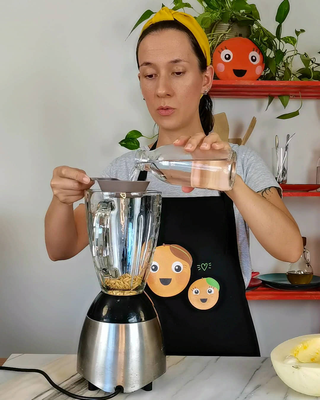 - De seguida, acrescenta 2 vezes a medida de sementes com água.Por exemplo, um melão que dê ½ chávena de sementes, coloca 1 chávena de água.