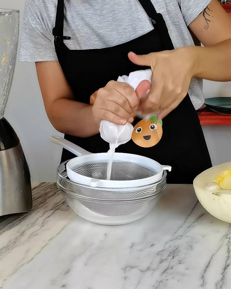 Coe bem o leite para evitar partes fibrosas das sementes.