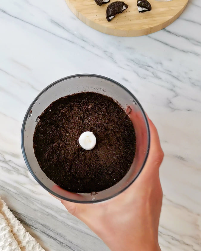 - Tritura as bolachas numa picadora ou coloca num saco de plástico e bate com o rolo da massa.