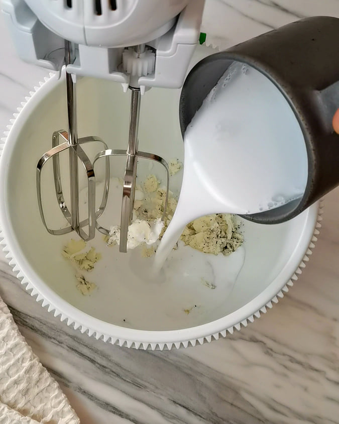 - Com a batedeira eléctrica, bate o recheio com as natas vegetais.