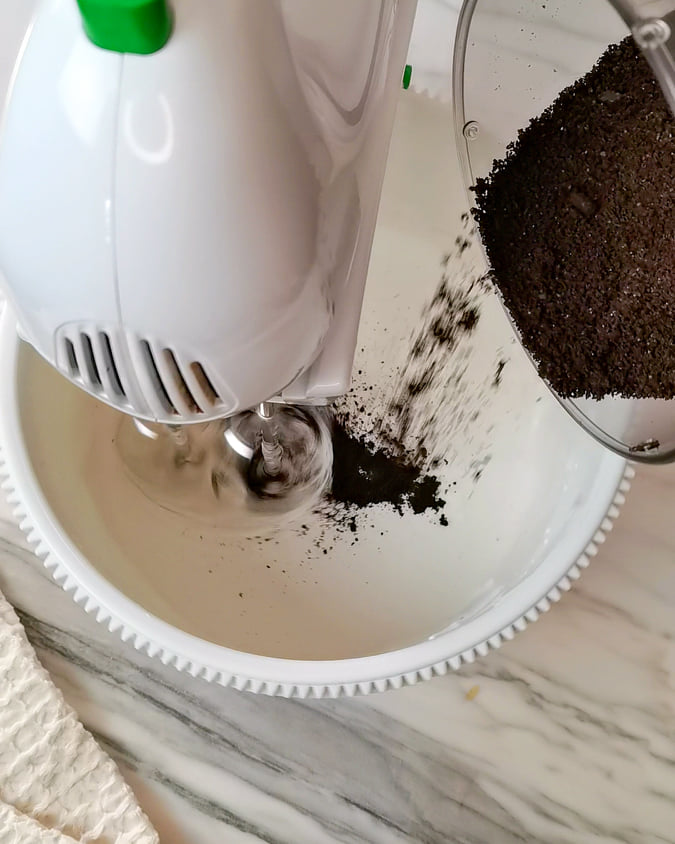 - Adiciona às natas, a bolacha triturada e o leite condensado vegan. Bate em velocidade baixa apenas até envolveres tudo e obteres um creme homogéneo.