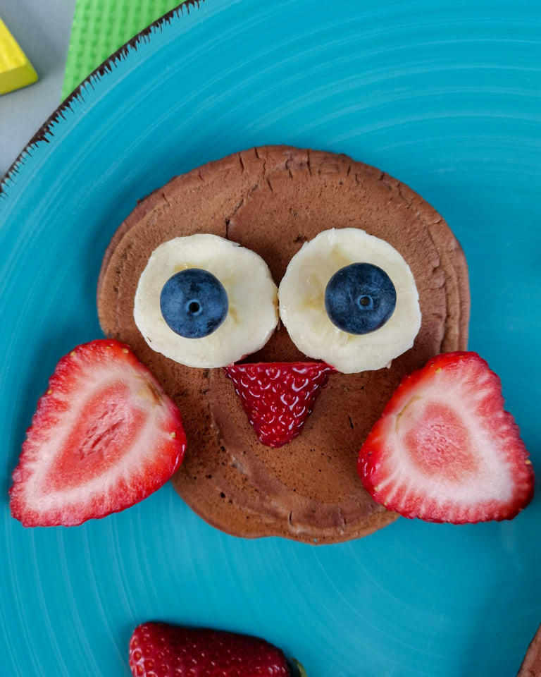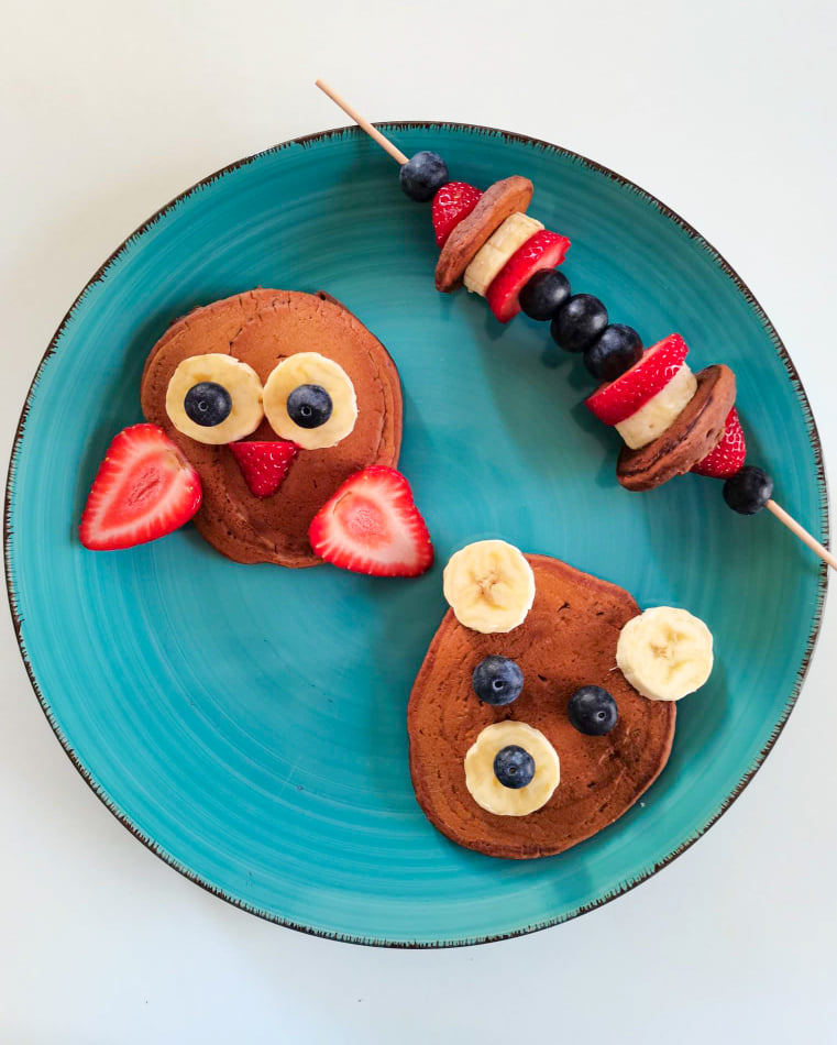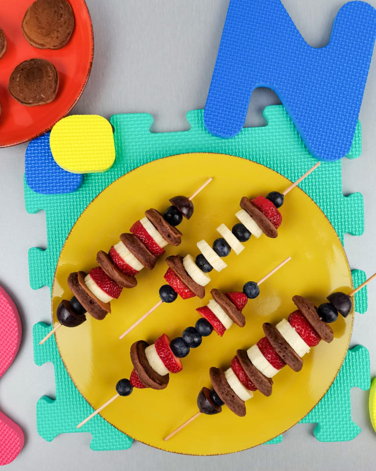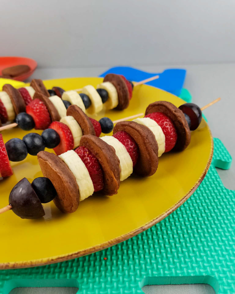 - Podes também fazer mini-panquecas e construir espetadas de fruta e panquecas.