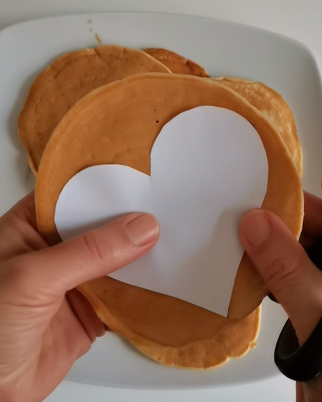 - Panquecas: Segue a receita indicada nos ingredientes para preparar as panquecas. Se tiveres uma frigideira em forma de coração, melhor ainda! Caso contrário, usa uma frigideira antiaderente e recorta as panquecas em forma de coração com uma tesoura e um molde de papel.