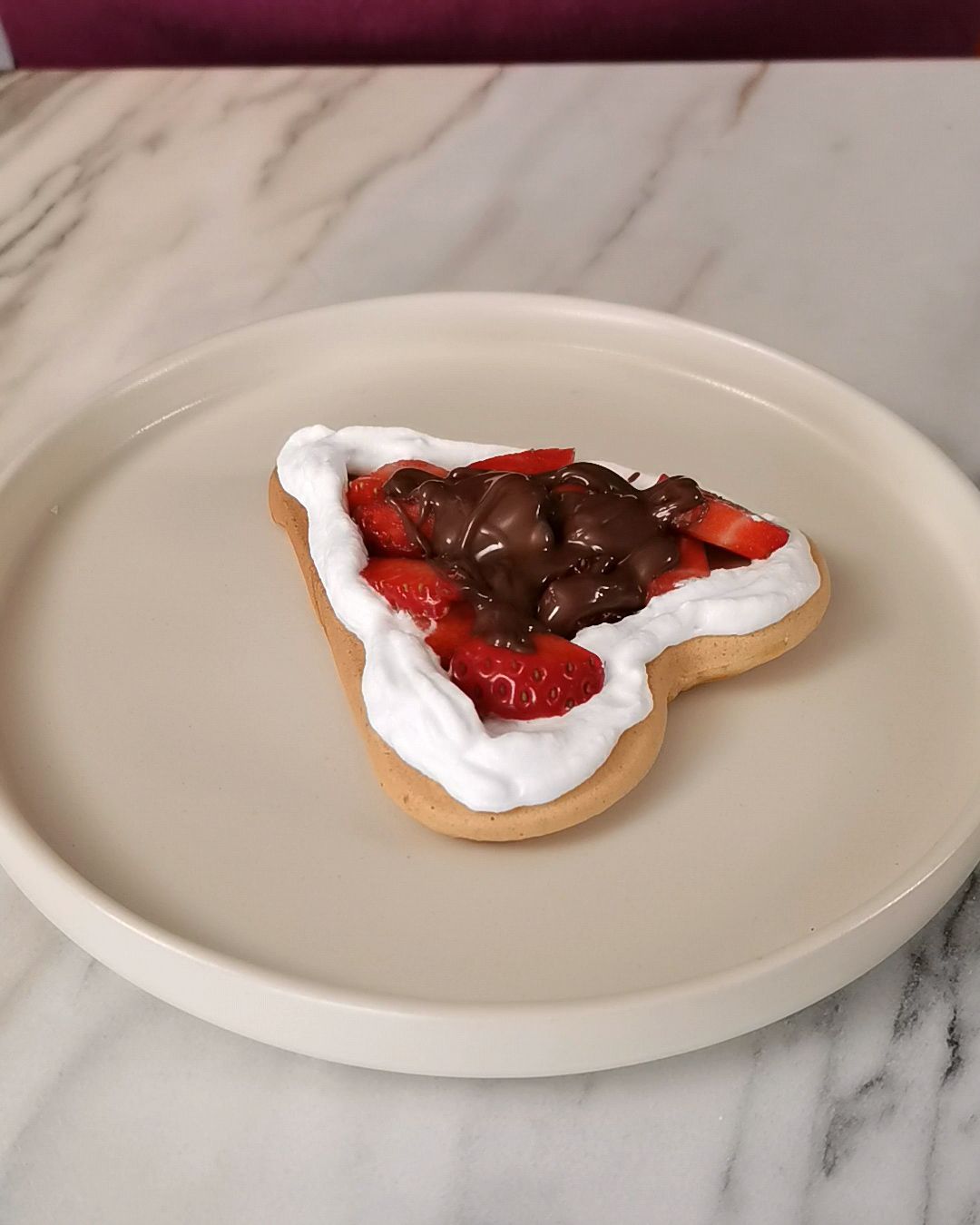 - Num prato para servir, coloca 1 panqueca, de seguida passa as natas em todo o redor do coração.