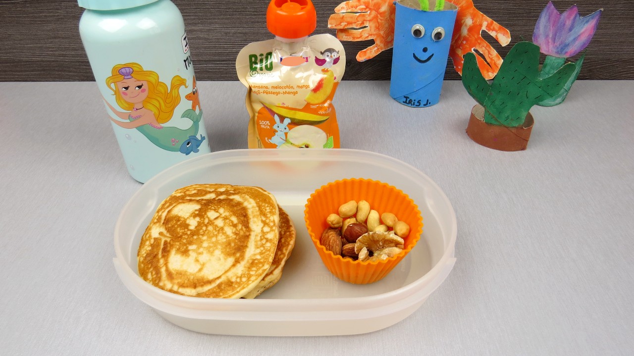 Se tem crianças aposte nestas panquecas, as crianças adoram, são óptimas para comer em casa ou levar para a escola um lanche saudável. Deixo, em baixo, uma sugestão para compor o lanche. É um dos lanches que a minha filha (8 anos) leva para a escola.