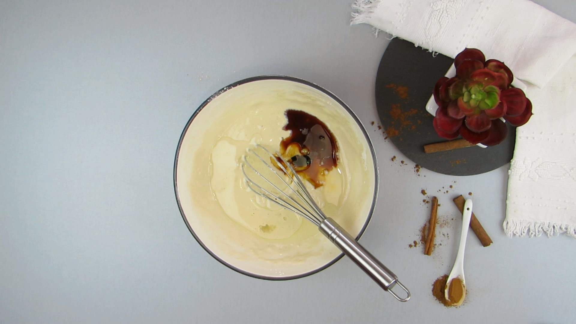 - Adiciona a essência de baunilha, o óleo e o vinagre. Mexe até estar homogéneo.