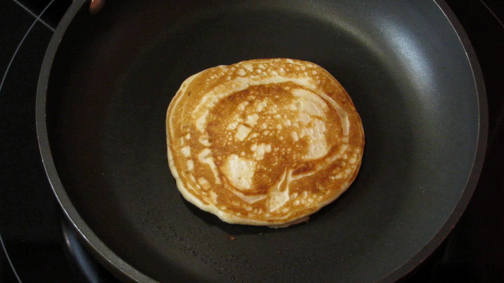 - Numa frigideira anti-aderente, pré-aquecida e pincelada com óleo, deita 2 colheres de sopa no centro da frigideira alisa um pouco e deixa cozer por cerca de 1 minuto de cada lado. Atenção: não tenhas o lume muito alto pois a panqueca queima com facilidade. Repite até terminar a massa. Se tiveres uma frigideira grande podes fazer 3 de cada vez.