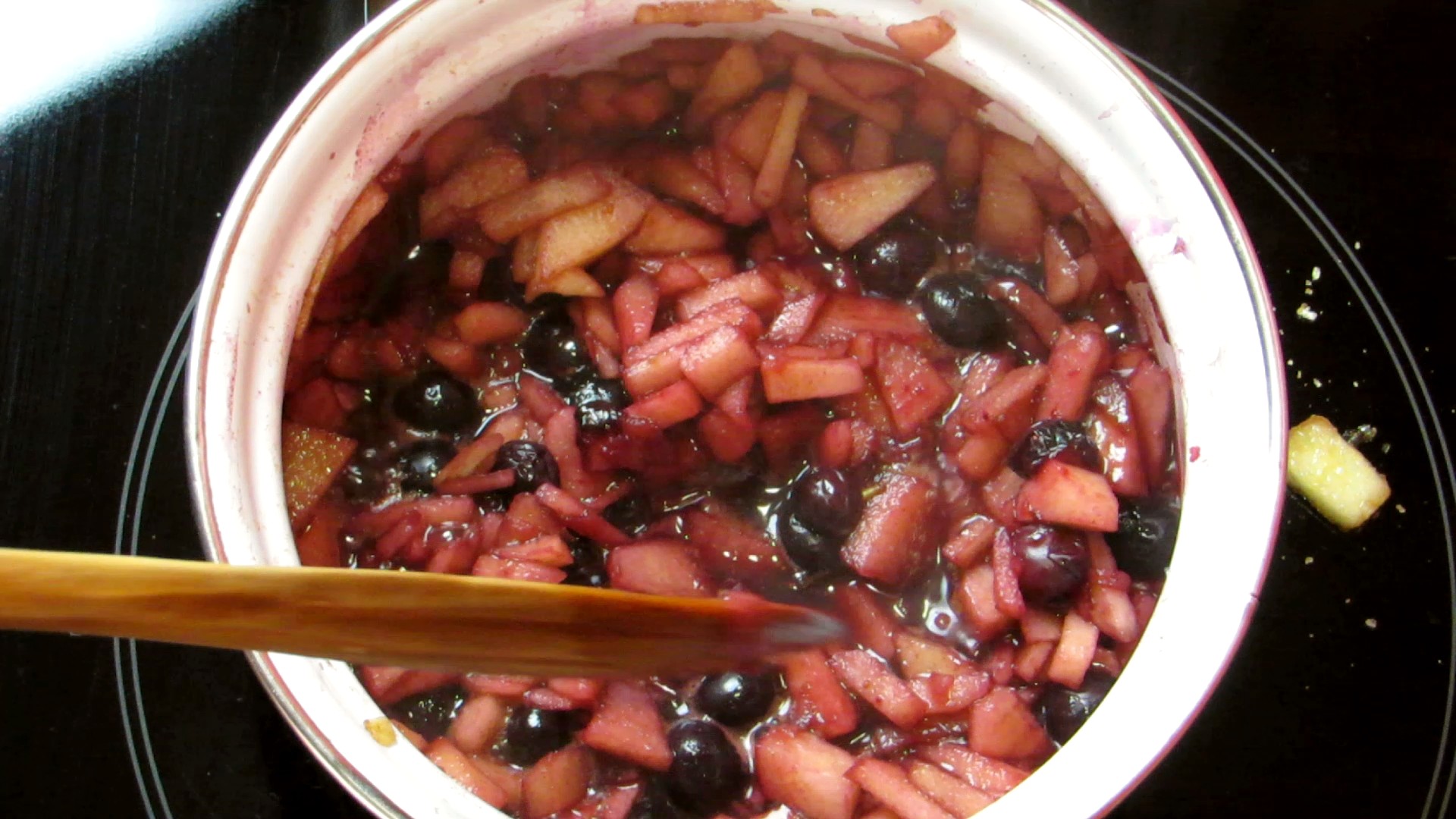 - Num tacho pequeno, coloca a água, as maçãs, os mirtilos, o açúcar e a canela. Mexe e deixe cozer por cerca de 10 a 15 minutos ou até que as maçãs fiquem bem cozidas.
