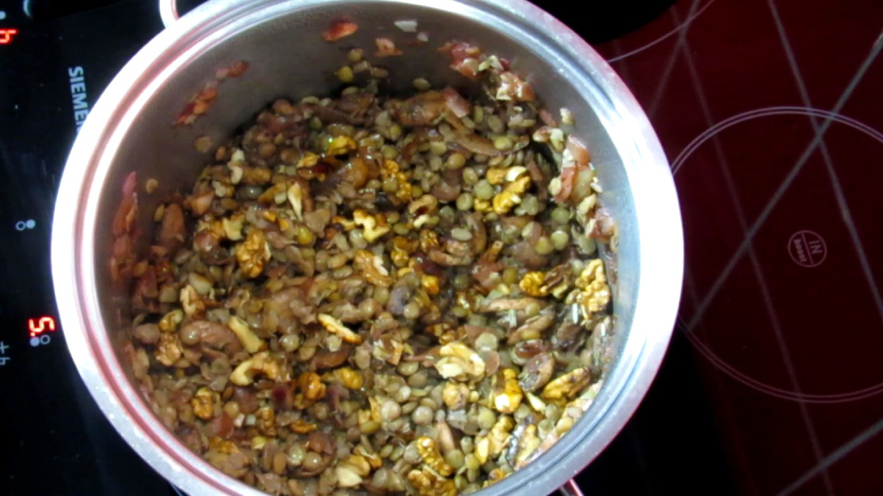 - Junte as nozes, as lentilhas e o molho de soja. Mexa, deixe uns 2 minutos e retire do lume.
