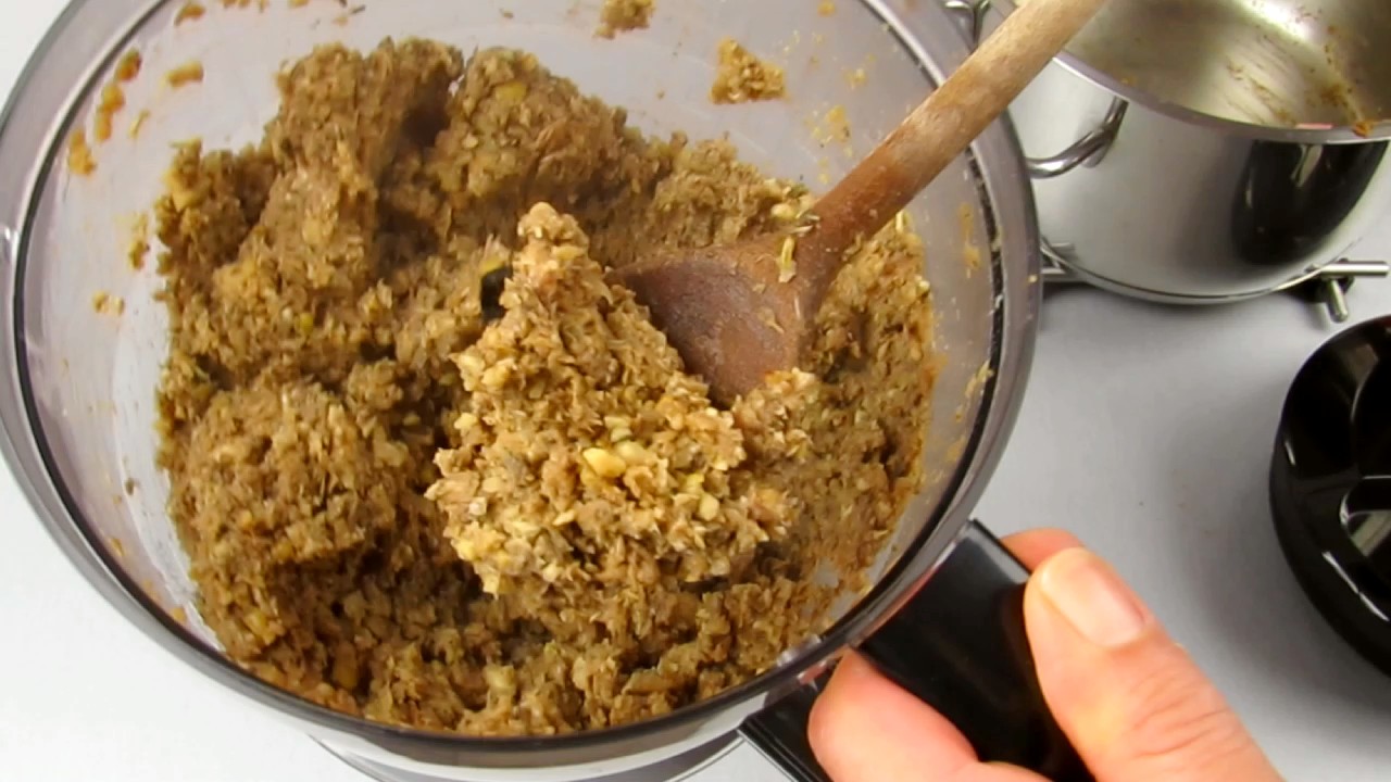 - Coloque a mistura num processador e triture até ter pedaços pequenos mas não reduzidos a puré.