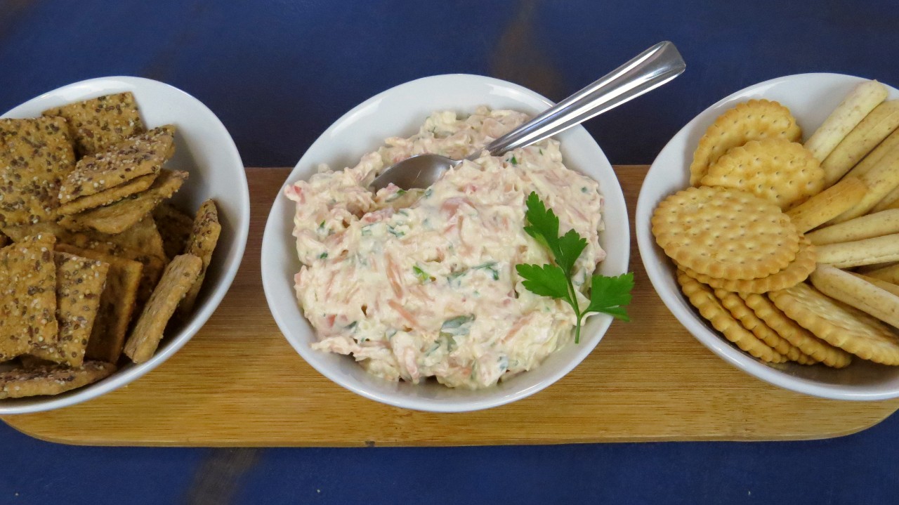 Sirva frio, decorado com folhas de salsa e acompanhado por tostinhas, pão torrado, bolachas de milho ou água e sal, gressinhos ou outros.