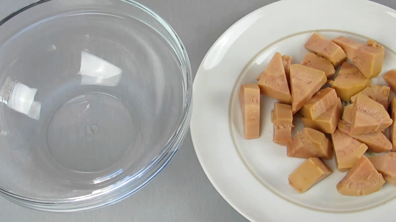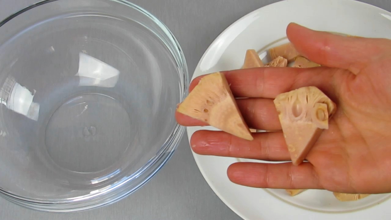 - Comece por desfiar a jaca com as mãos, se tiver algum pedaço mais duro do interior pique-o fino.