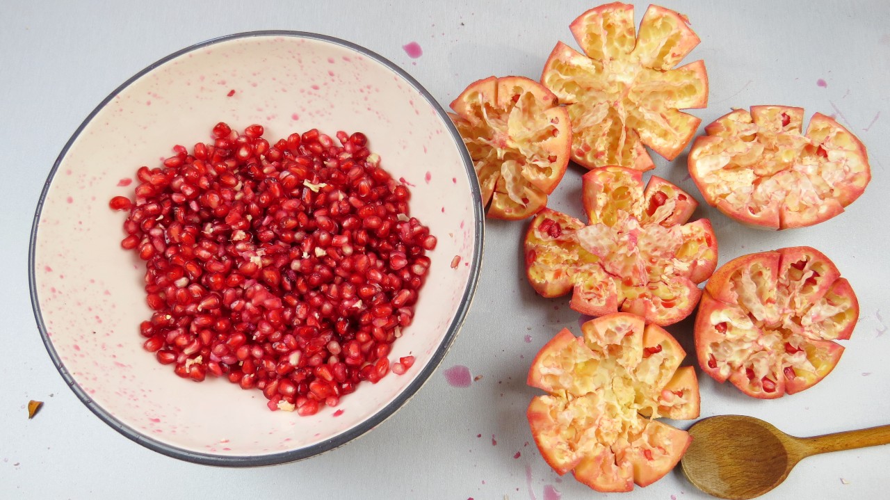 Para retirar as sementes de forma rápida e eficaz, veja o vídeo na nossa página de facebook, ou então descasque a romã e retire as sementes carnudas.