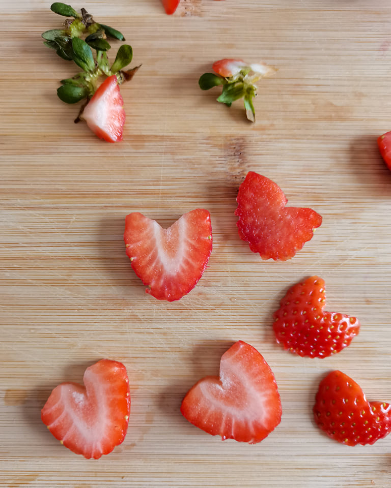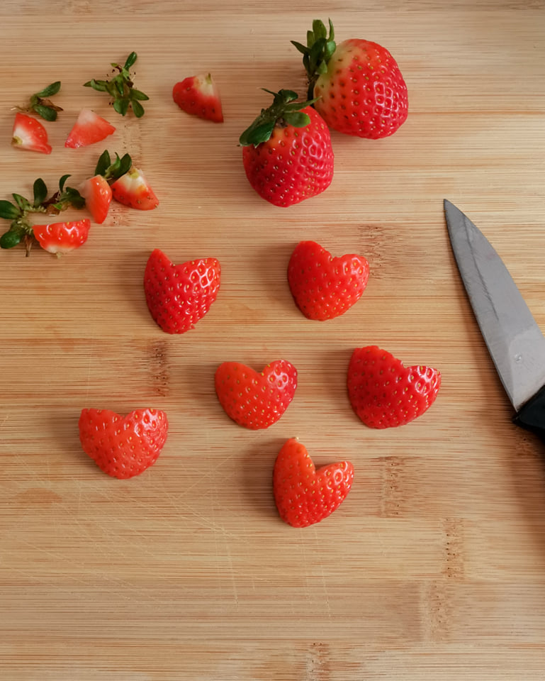 - Corta os morangos aos meio e depois a parte de cima em V.