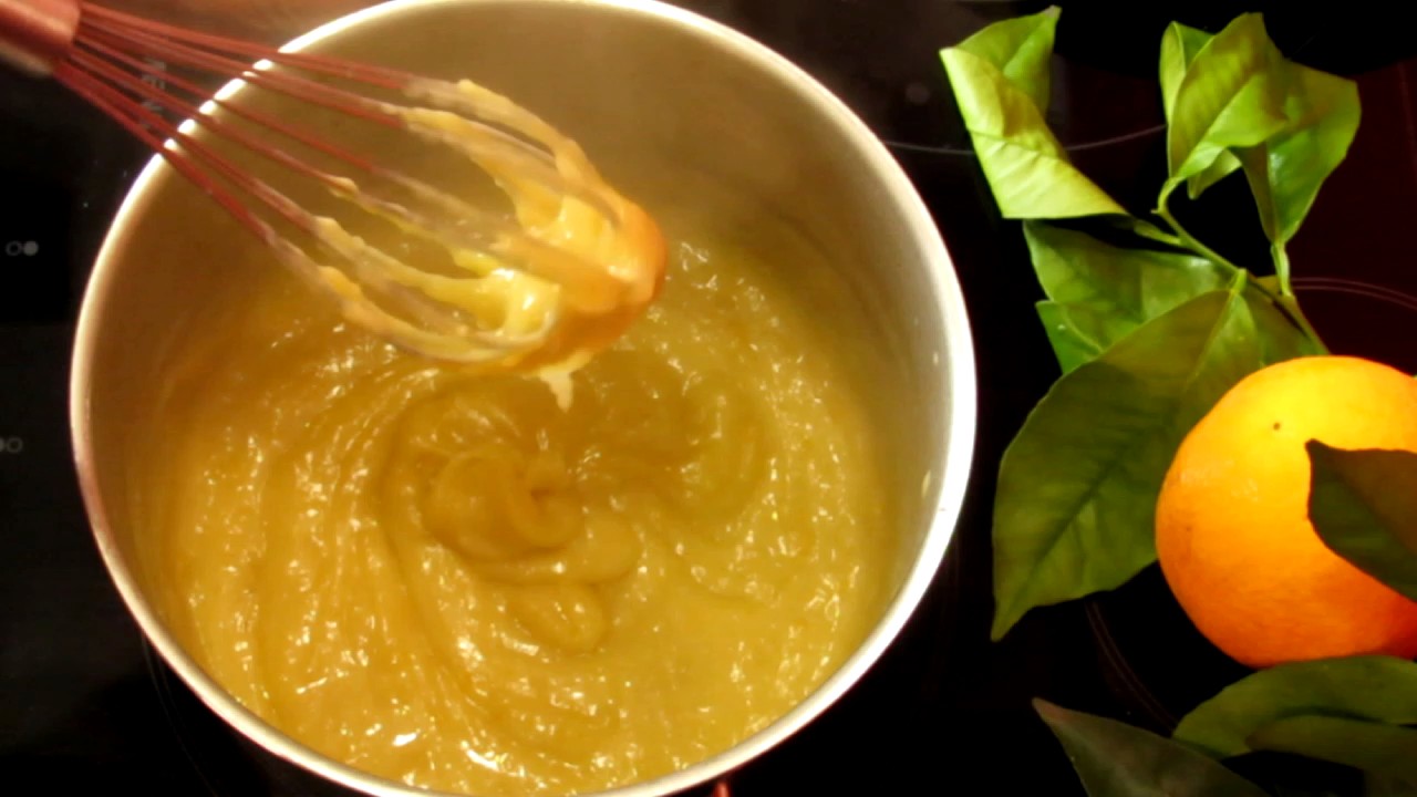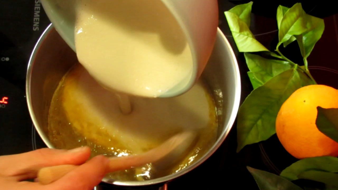 - Coloque um tacho no lume médio com o sumo de laranja, a raspa e o açúcar amarelo. Mexa bem até dissolver o açúcar.