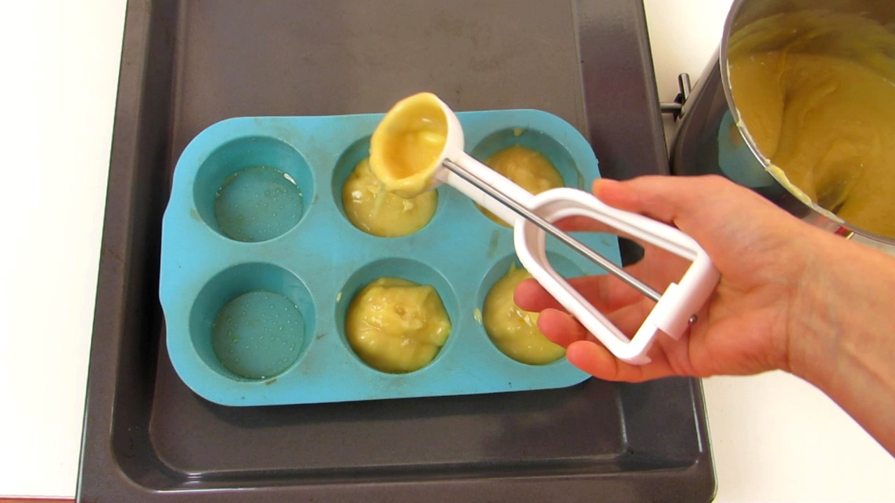 - Distribua de imediato a massa numa forma de silicone previamente untada com azeite. Esta massa rende cerca de 8 a 9 unidades.