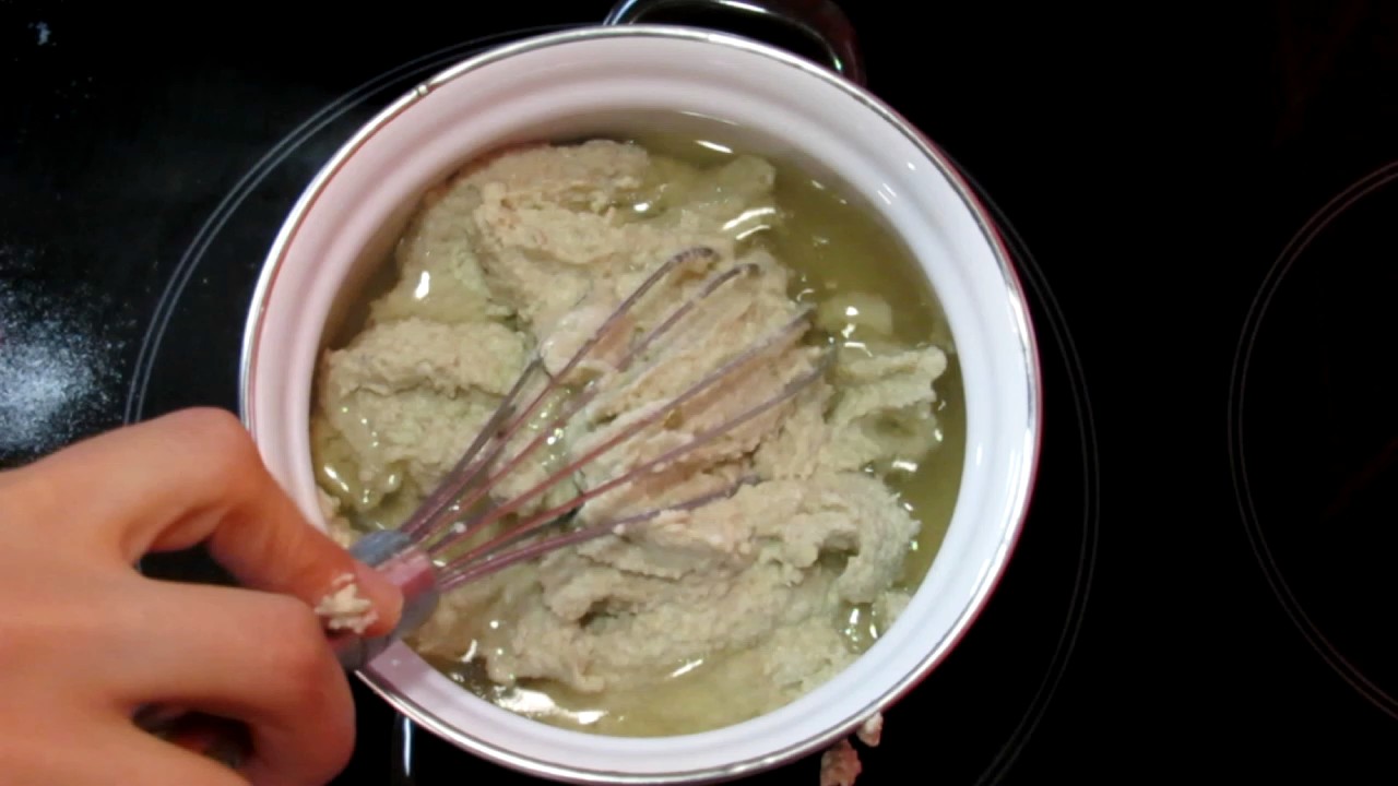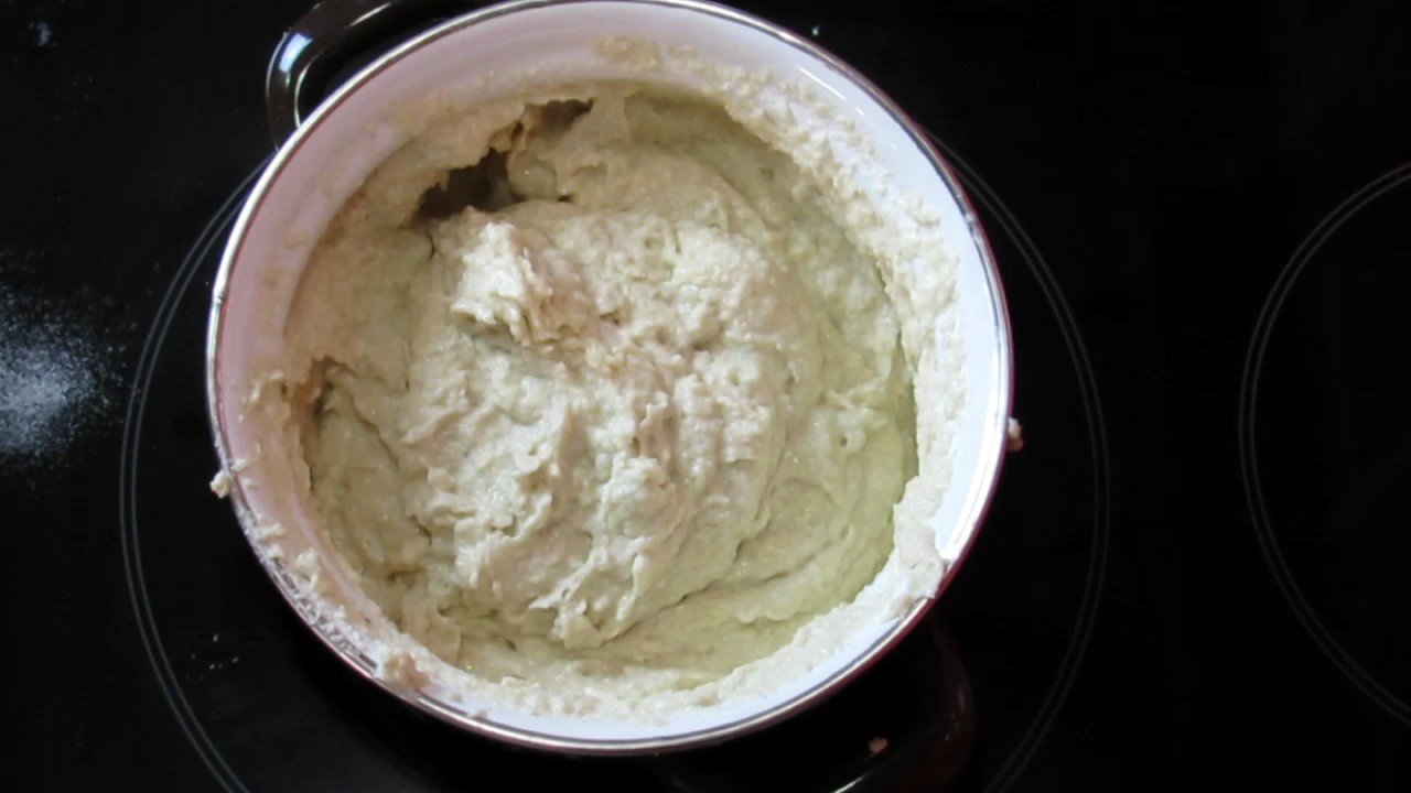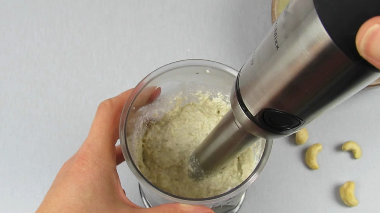 - Num copo alto, coloque todos os ingredientes com EXCEPÇÃO da água, do ágar-ágar e do sal grosso. Triture bem com a varinha mágica até obter uma massa lisa.