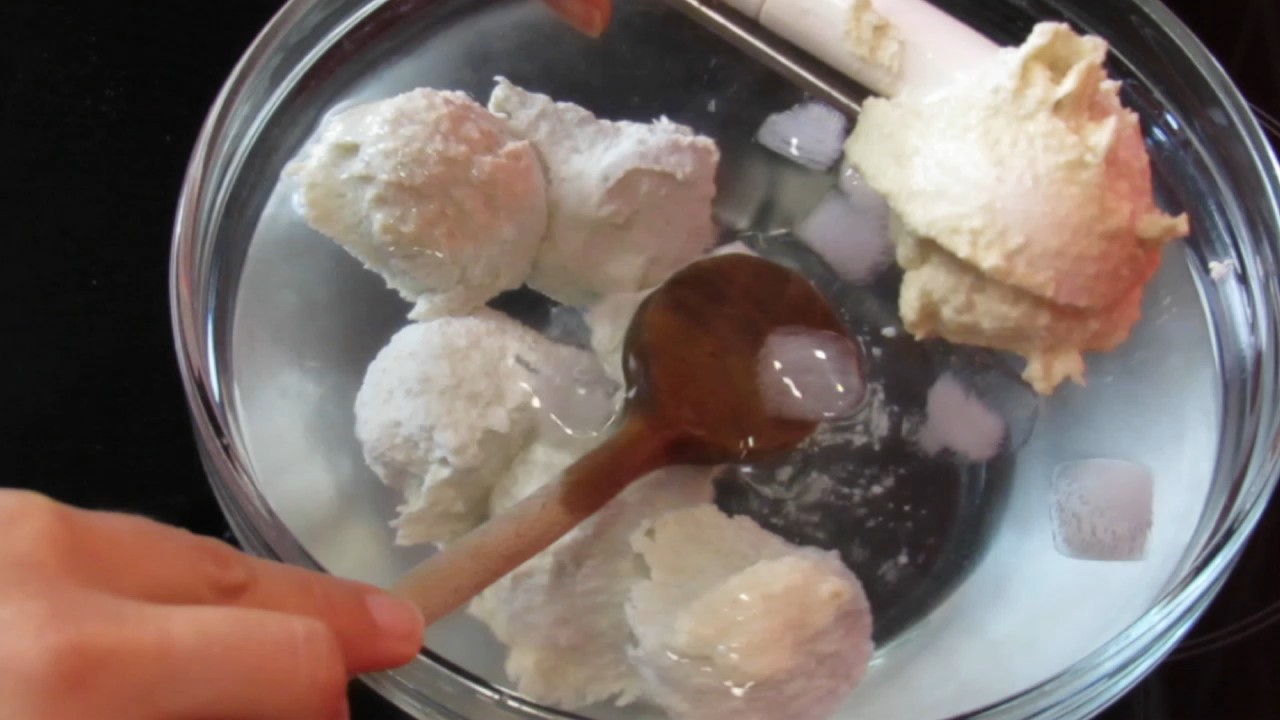 - com uma colher de gelado formar bolinhas e colocar em água gelada