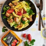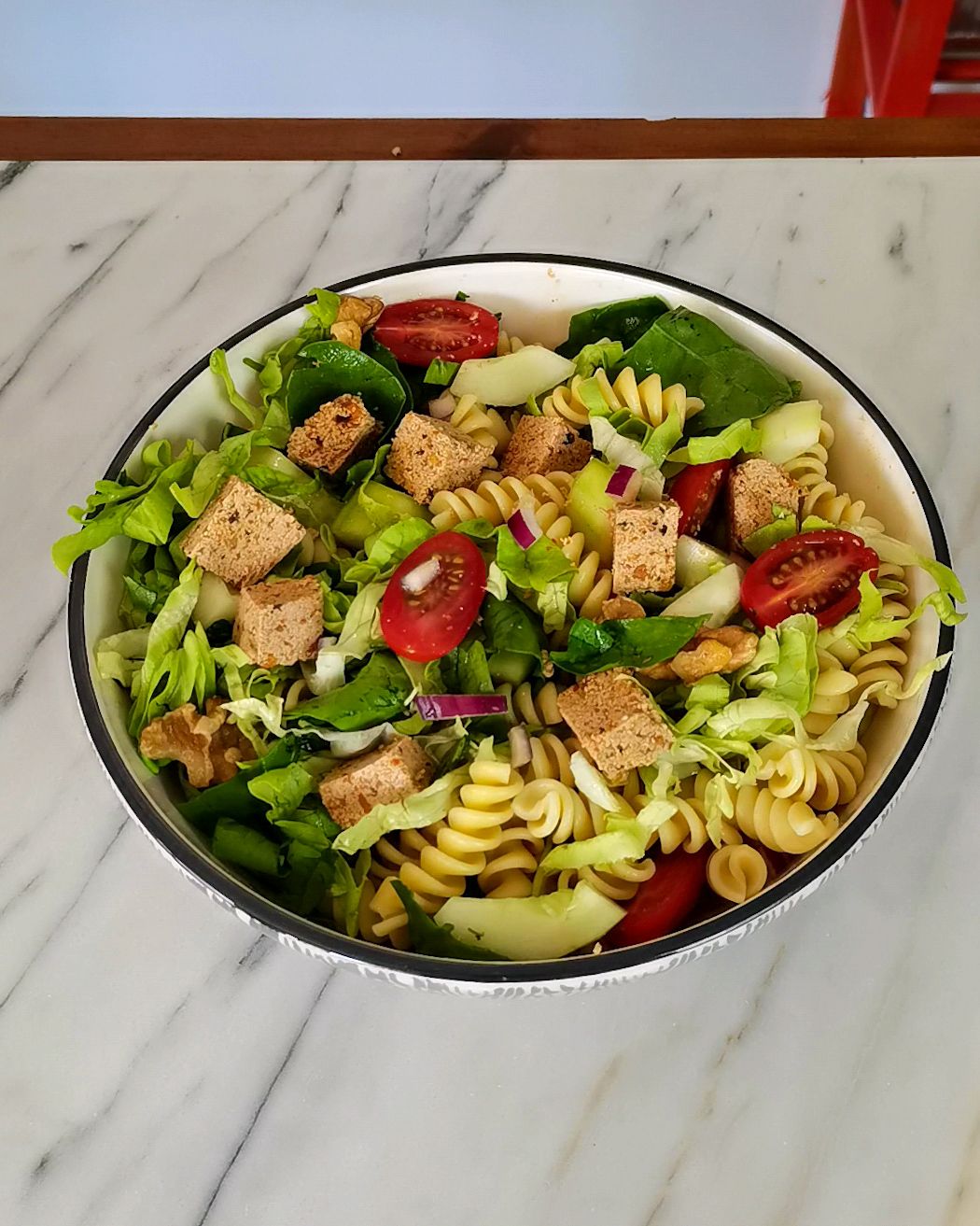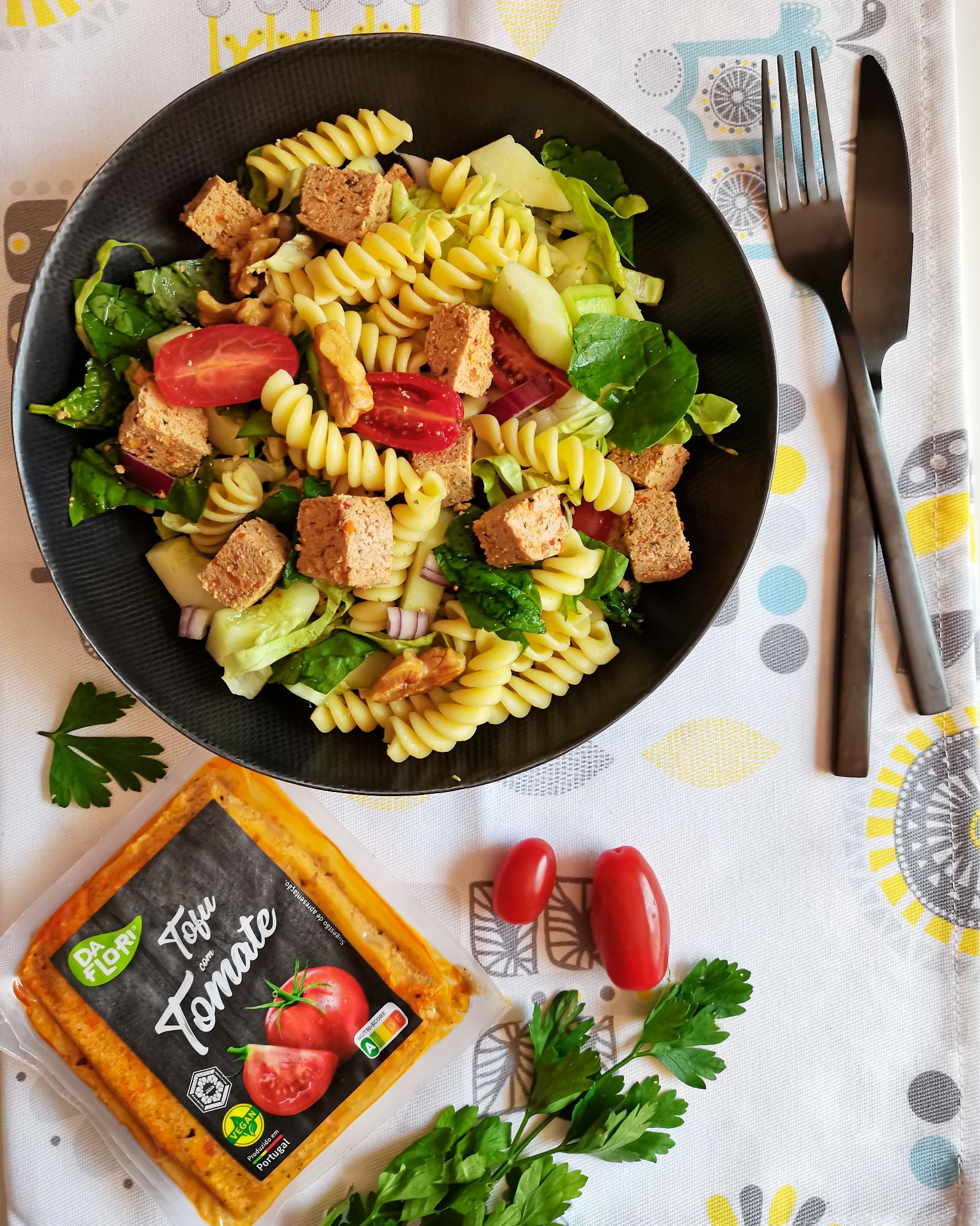 Os ingredientes são simples e saudáveis: alface fresca, massa espiral cozida, pepino crocante, tomate cherry suculento, cebola roxa picante, espinafres nutritivos, nozes para adicionar uma textura crocante, além do destaque principal – o tofu com tomate Daflori, uma opção deliciosa e prática para uma refeição vegetariana. Aqui está uma ótima opção para quem não sabe ou não tem tempo para marinar tofu, basta retirar da embalagem e está pronto!