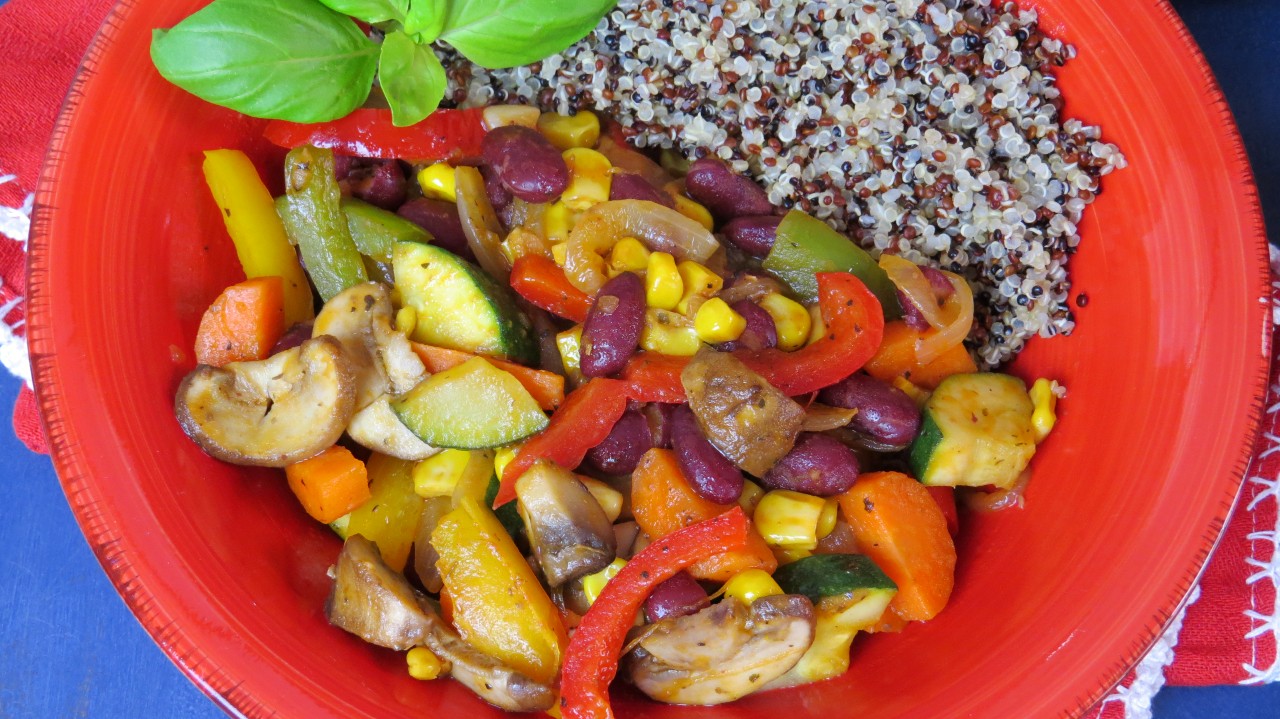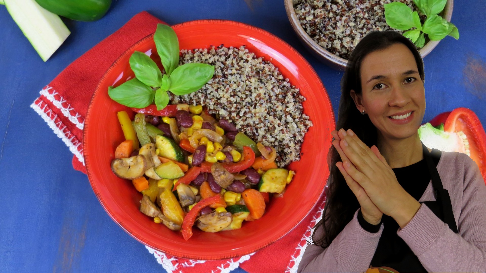Este salteado de legumes e cogumelos é acompanhado por uma quinoa tricolor e fica muito bem acompanhado 🙂 tornando este prato mais saboroso e com aporte nutricional mais elevado.