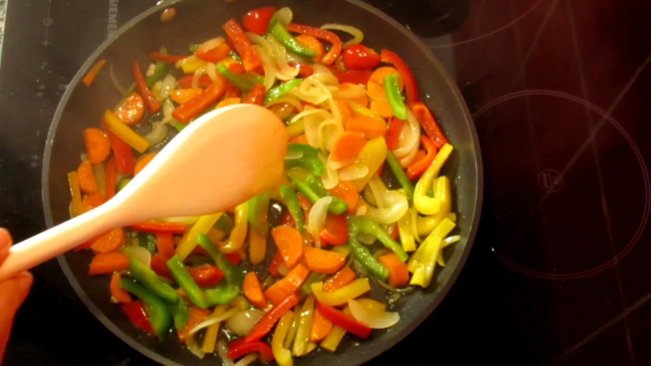 - Junte os pimentos e o alho, mexa e deixe ao lume durante uns minutos.