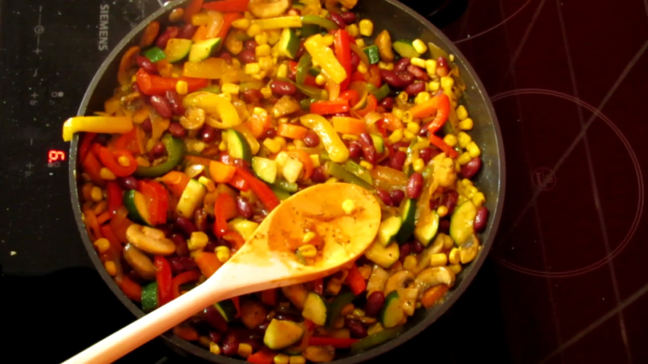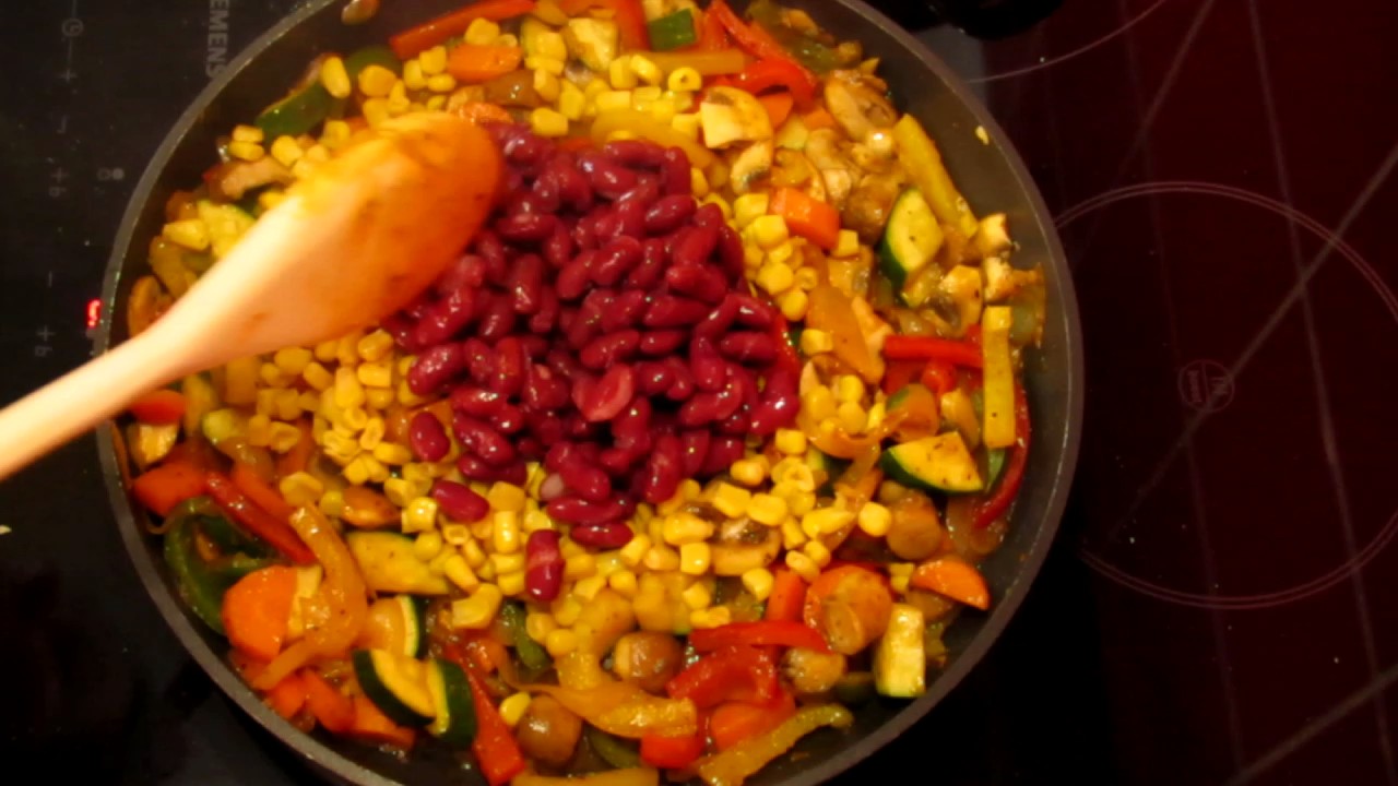 - Acrescente o milho e o feijão. Mexa e deixe por breves minutos. Prove e rectifique os temperos se achar necessário.