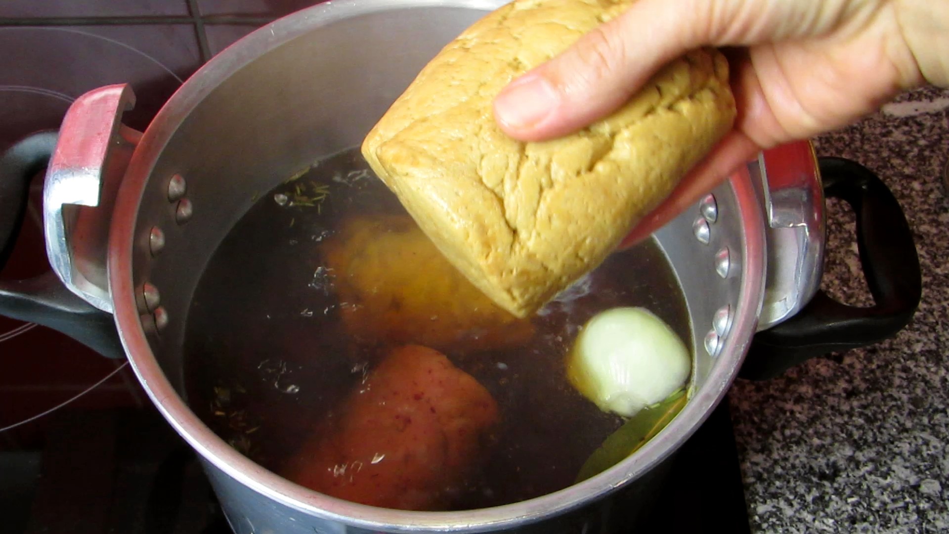 - Numa panela, coloque os ingredientes para cozer e junte água de forma a cobrir o seitan. Quando começar a ferver coloque o ou os seitans, mexa para que não agarre ao fundo e deixe cozer por 30 minutos na panela a pressão ou por 1 hora numa panela comum.
