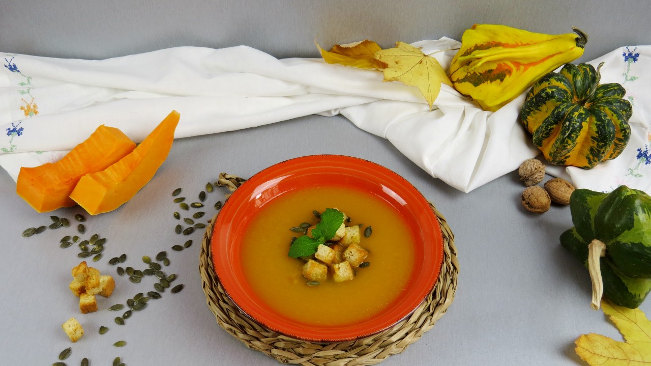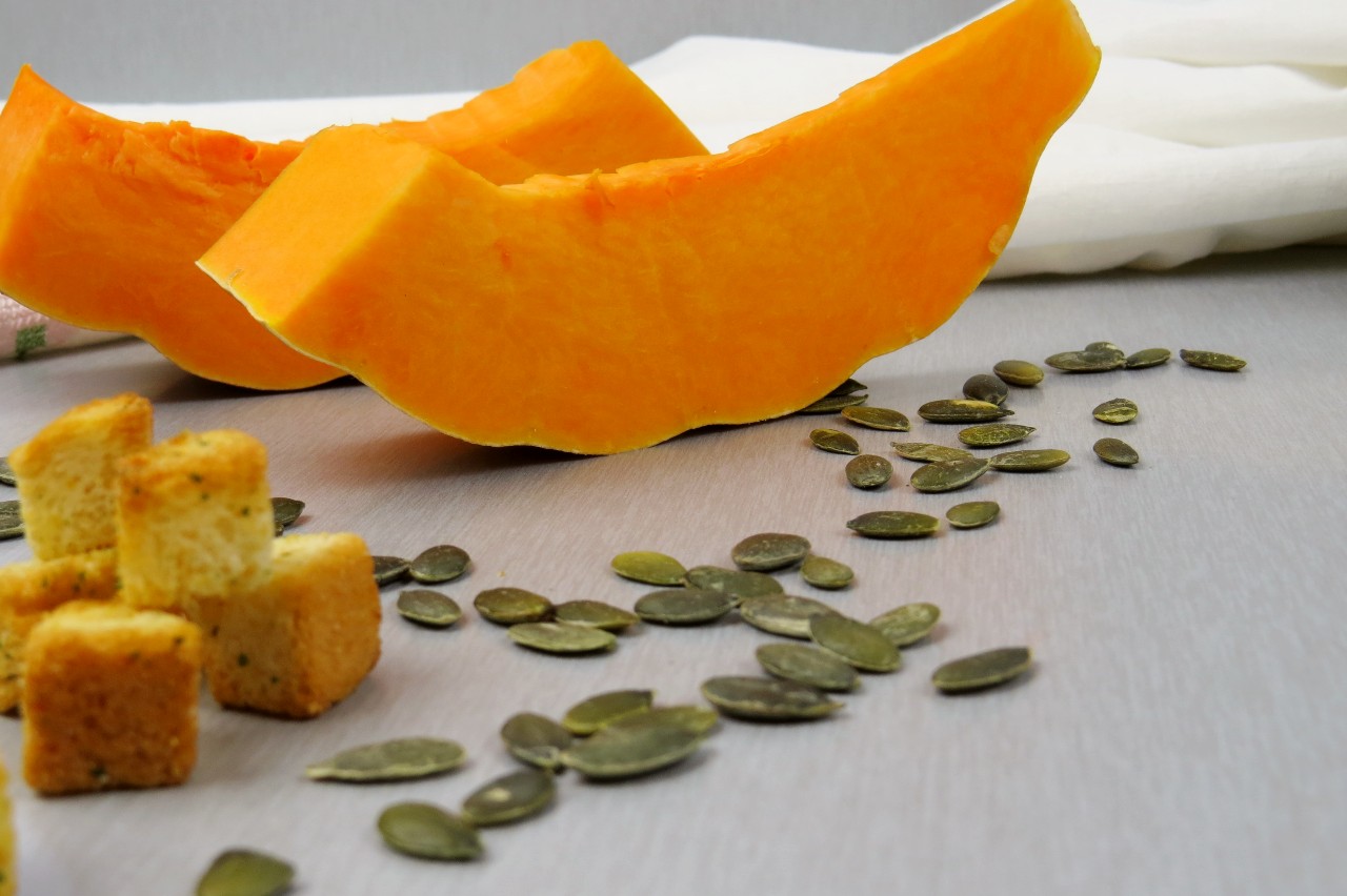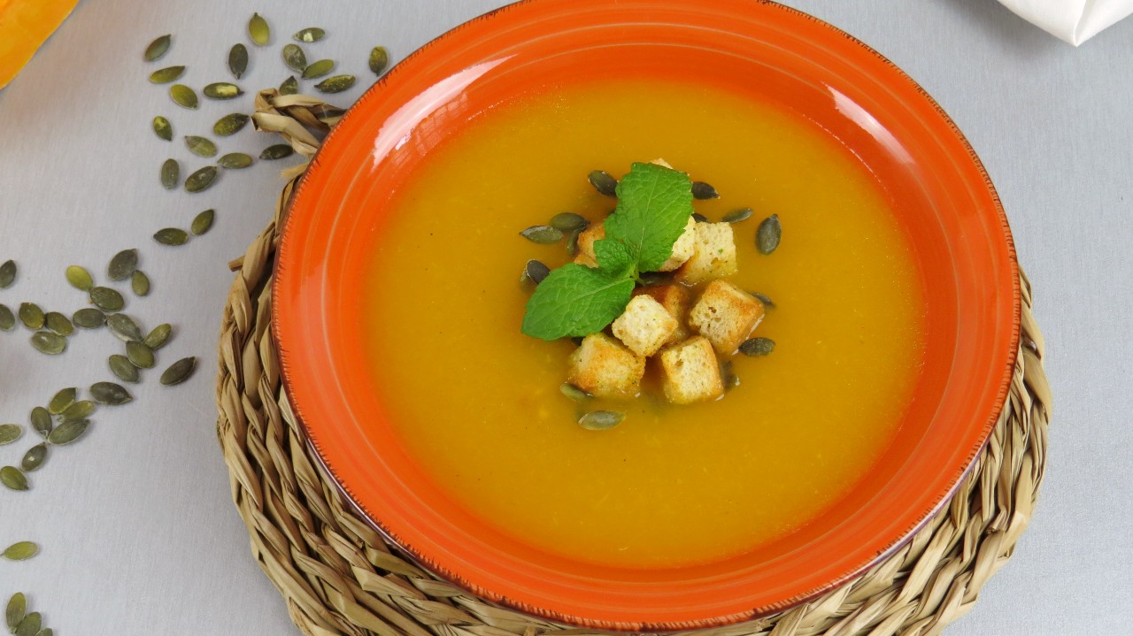 Uma saudável e cremosa sopa de abóbora acompanhada com estaladiços croutons e sementes de abóbora, uma combinação divinal!